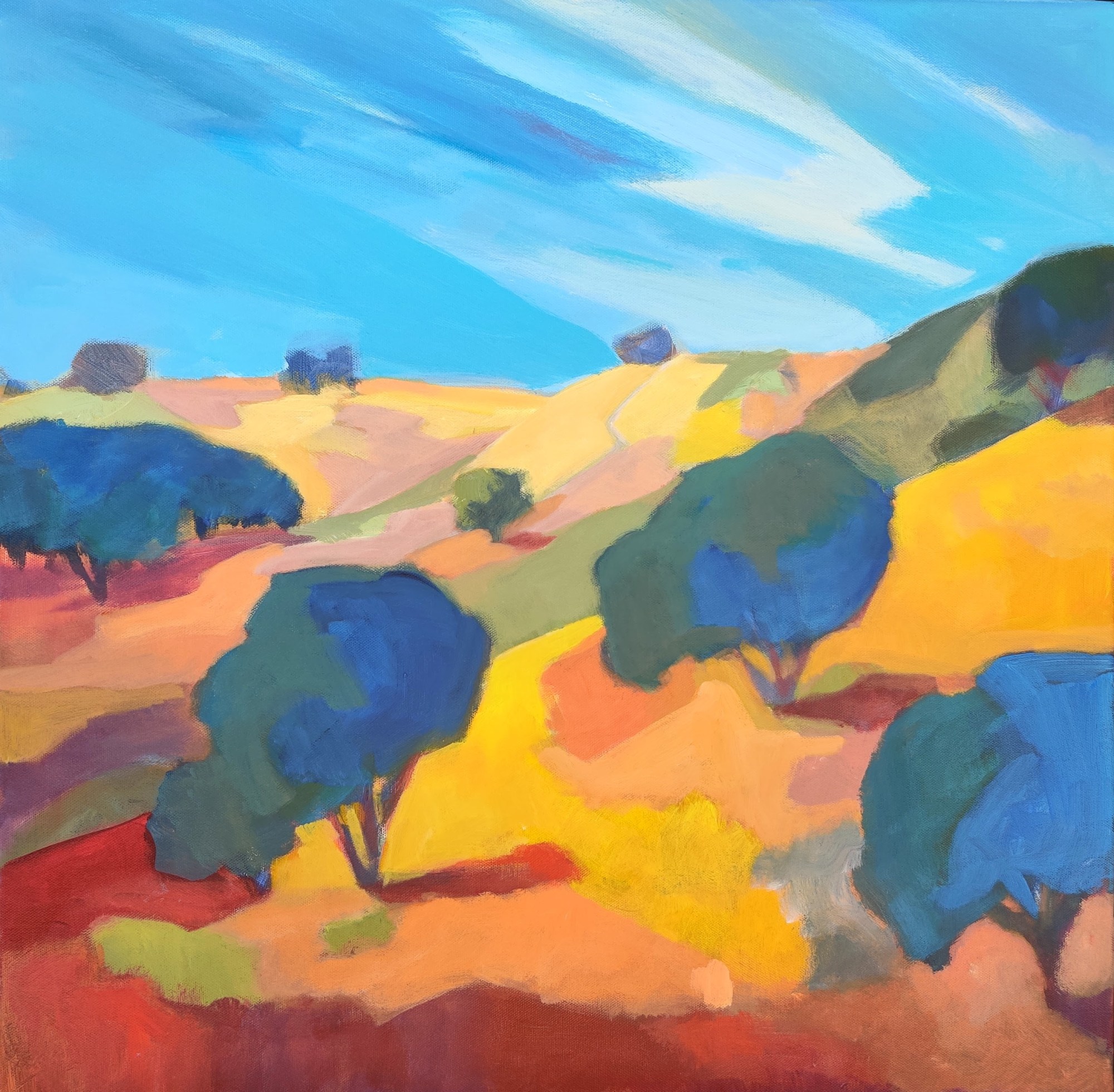 Views to the western ridges of the Bay Area, we pass through oak-studded meadows, grasses drying in the early summer warmth. The rainy season has passed but will bring green once more as the cycle turns.
