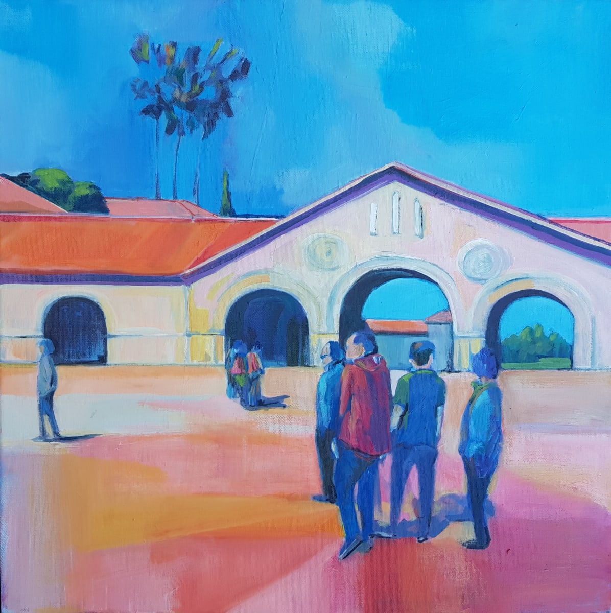 Admiring the classical setting of the Quad at Stanford. The vast plaza holds eight large planters of exotic flora, bounded by carved sandstone colonnades, and the gilded facade of the Stanford chapel.