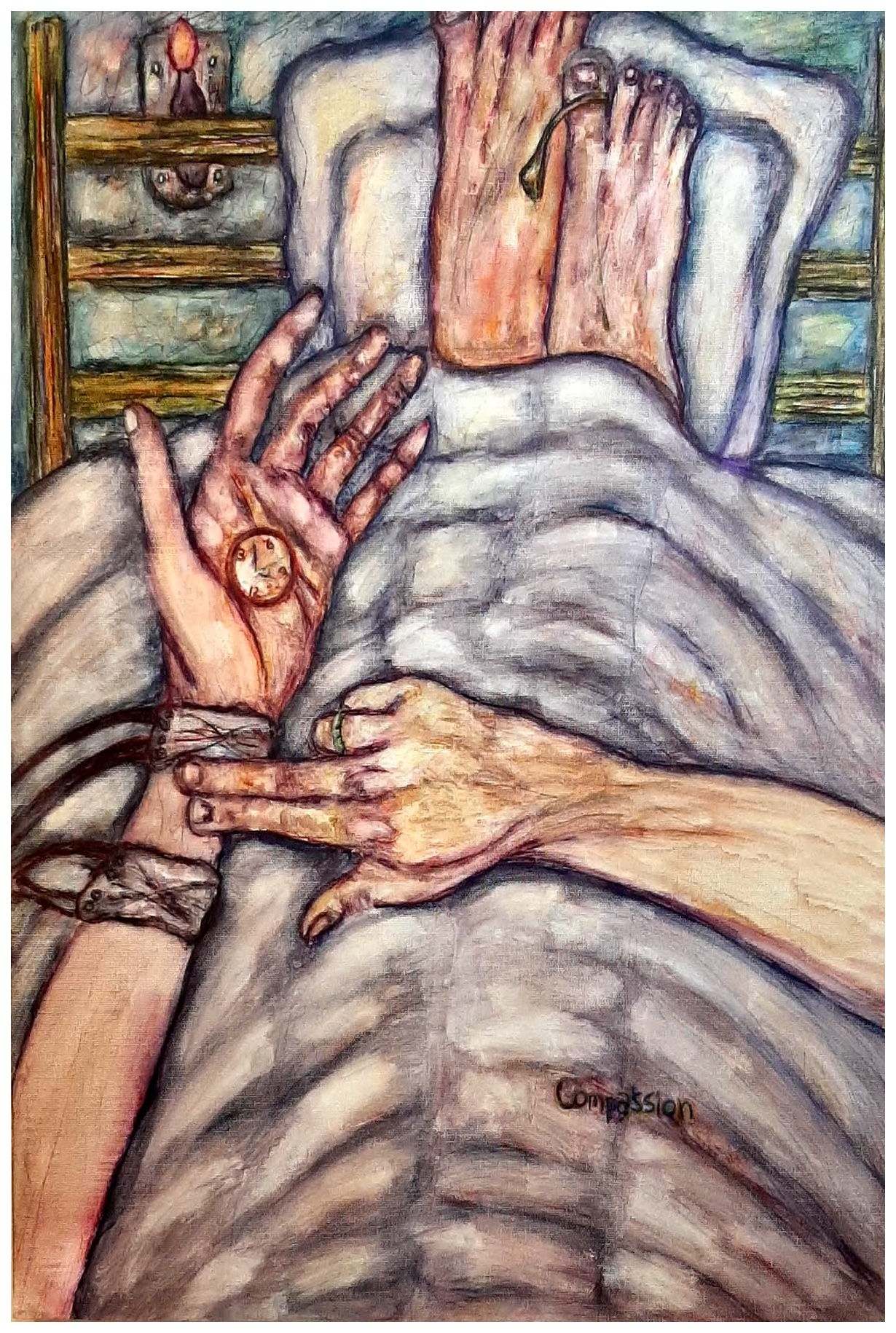 Evocative watercolor pencil on canvas paper with stained-glass tones. An expressionistic, tender painting of pathos depicting a restrained patient in bed, fingers on pulse, timer in palm, feet on pillows against bedframe, one toe tagged and a nightlight in the background. Buyer pays shipping. Prints available, contact artist, [email protected]