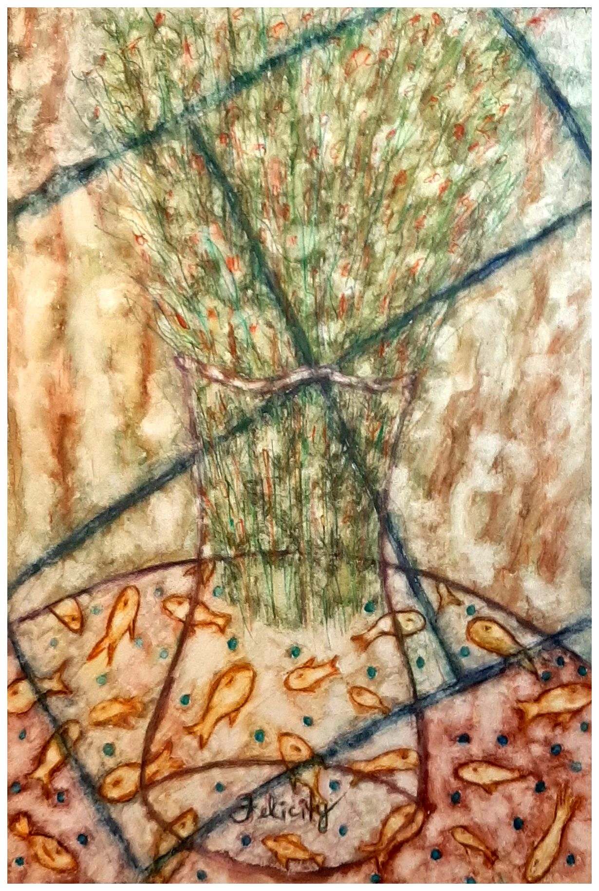 Evocative watercolor pencil on canvas paper depicting expressionistic flowers in clear vase on table with goldfish tablecloth, all superimposed transparently under the crossbeams of a window's shadow. Buyer pays shipping. Prints available, contact artist, [email protected]
