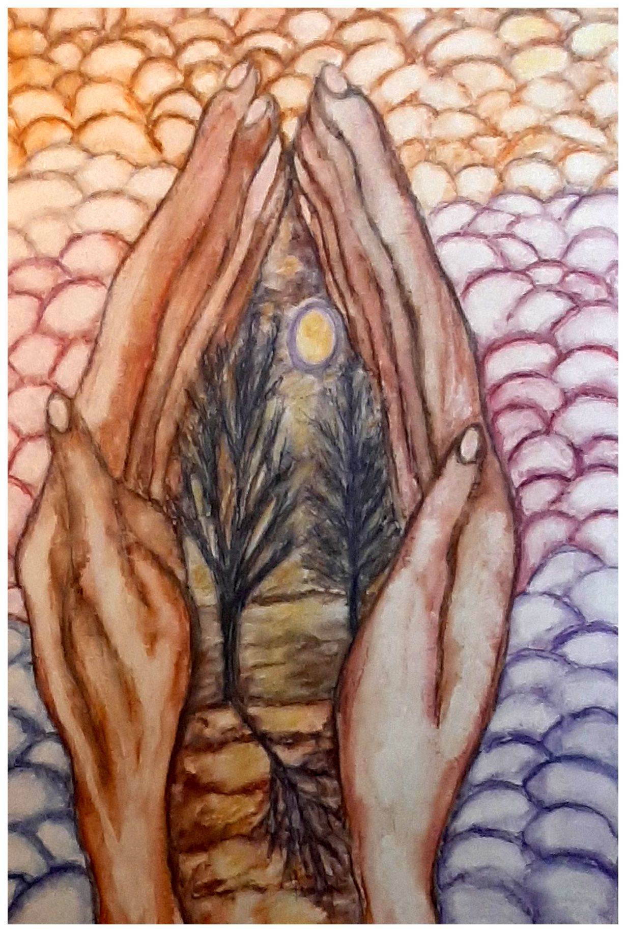 Evocative watercolor pencil on canvas paper depicting expressionistic spiritual, symbolic dreamscape of hands held up and opening to reveal a shadowy tree landscape, the hands themselves surround by egg-curves of a symbolic setting. Buyer pays shipping. Prints available, contact artist, [email protected]