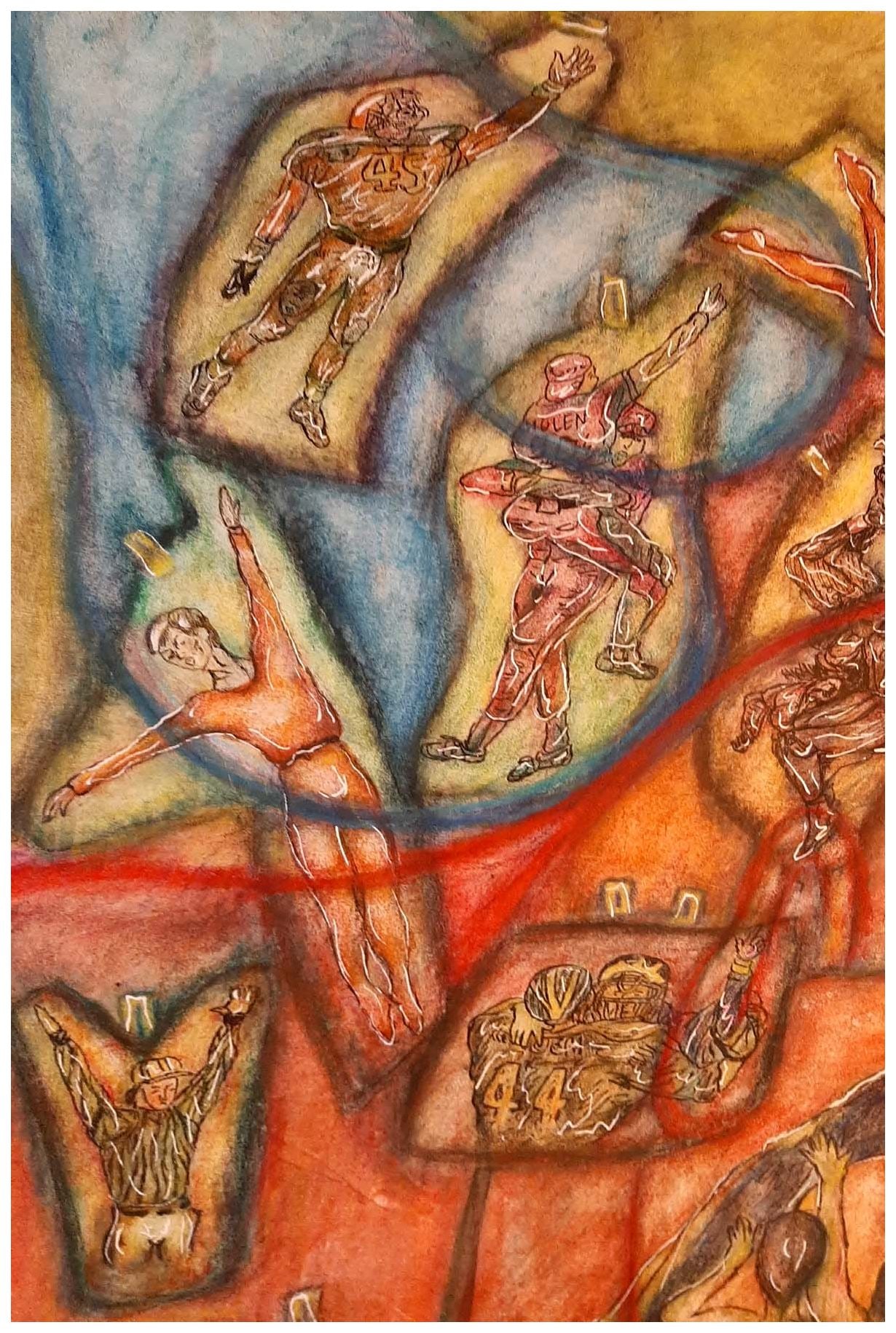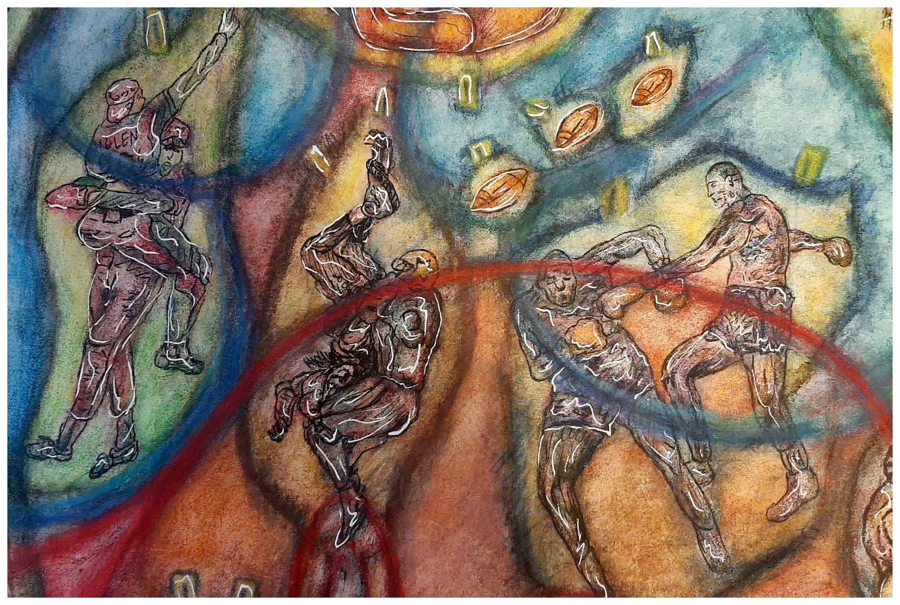 Large spiritual expressionistic piece based on "The Arena of Masculinity" by Brian Pronger. This painting explores the potential taboo of same-sex male intimacy vs. socially acceptable contact in sports. Buyer pays for shipping and handling in addition to price. Prints are available, contact artist, [email protected]