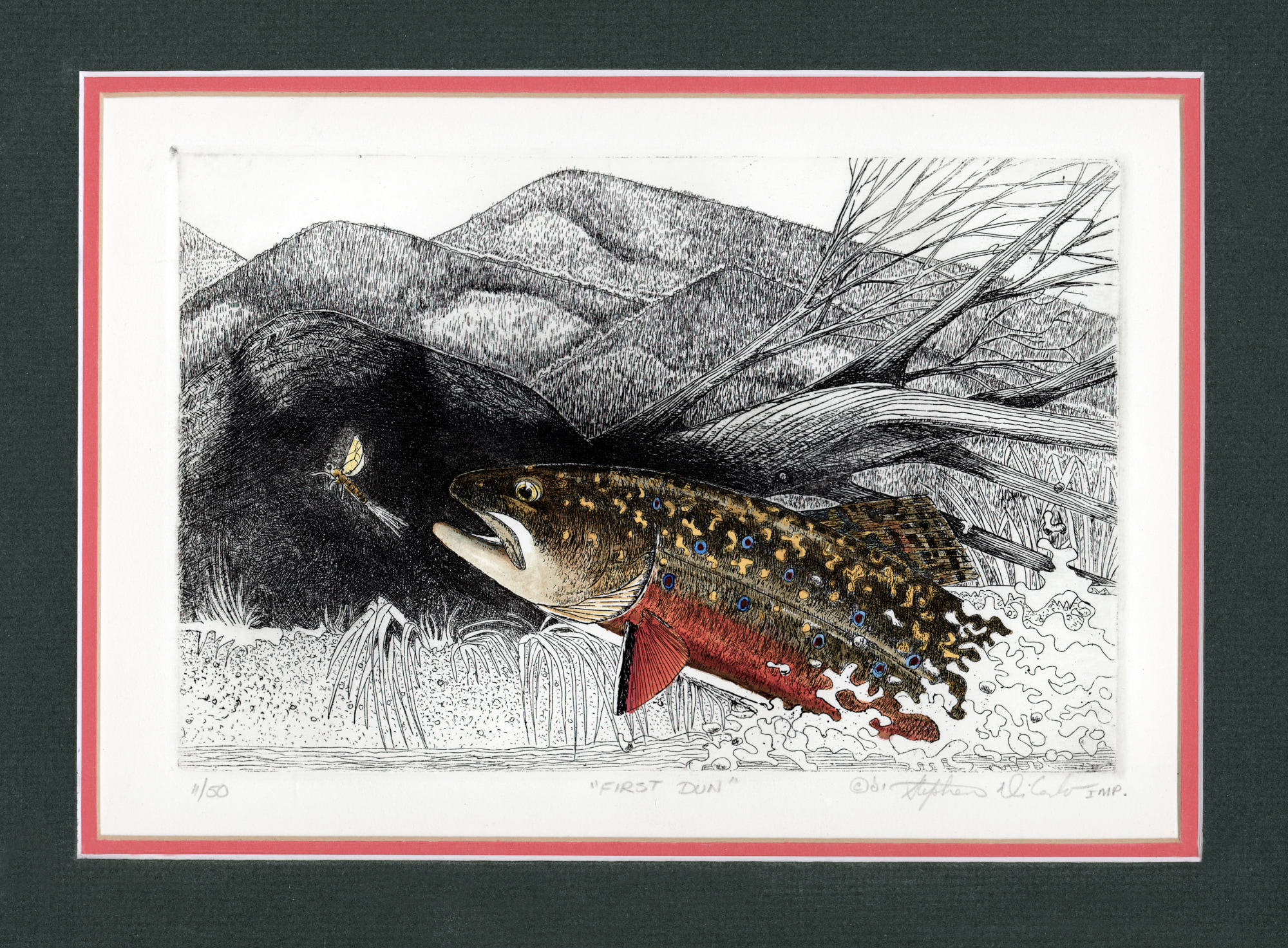 This image is a depiction of a rising Brook trout (Salvelinus fontinalis) on the first Hendrickson dun of the hatch
