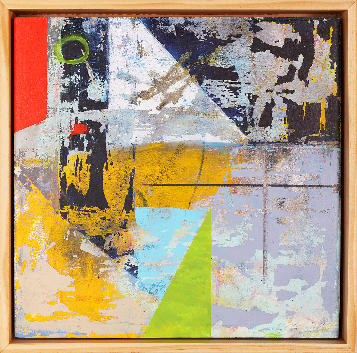 Original mixed media abstract oil painting by Stevenjohn McHugh titled "ARTifact #13". Measures 9.75" x 9.75" x 1.5. Framed size is 10.5 x 10.5" x 2.5". Mixed media with oil stick, marker, oil, graphite, charcoal and cold wax on Arches oil paper glued on wood panel with PH balance glue. Side of wood cradle (solid wood) is varished natural. Signed on front and back. Framed is a vanished gallery frame solid wood.
