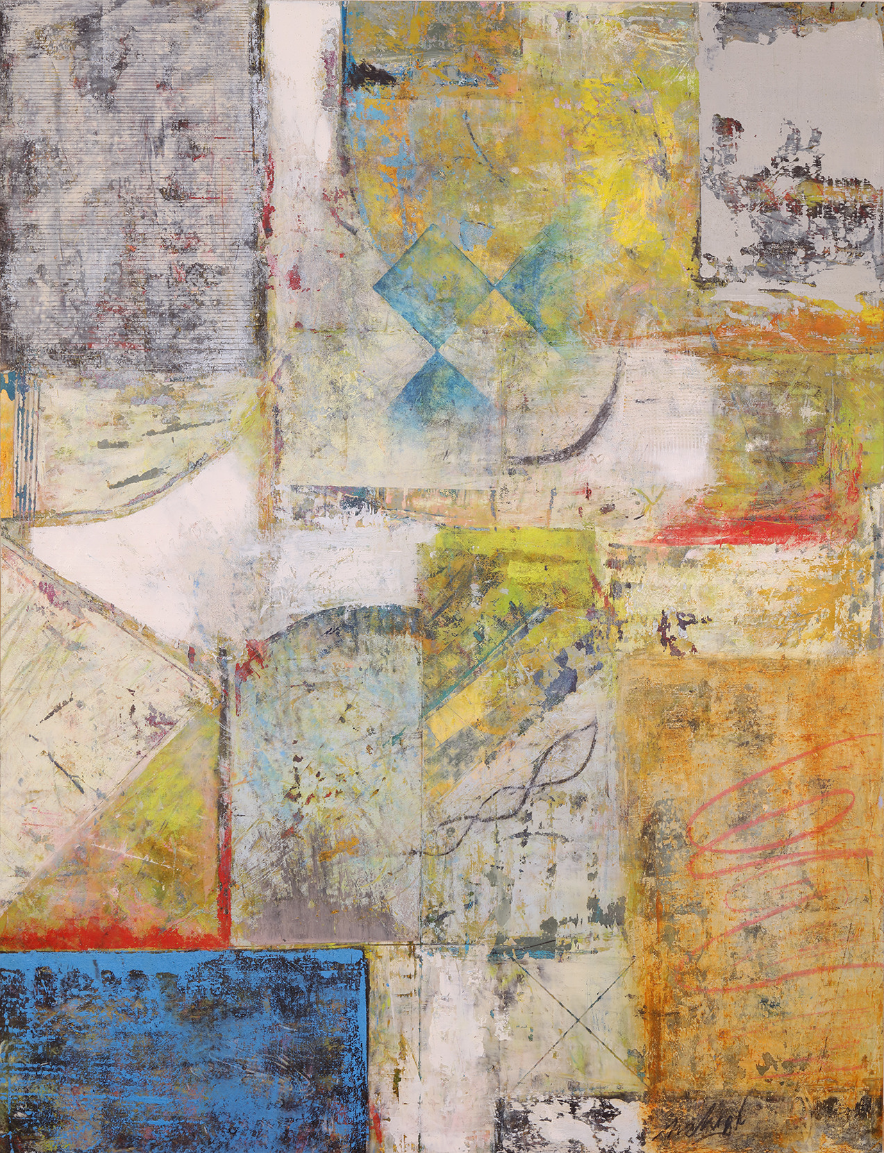The color palette is varied, dominated by earthy tones with punches of brighter colors like blue, yellow, and red. These colors are painted in broad blocks, intermingled with more muted whites, grays, and tans that create a sense of depth and wear.
