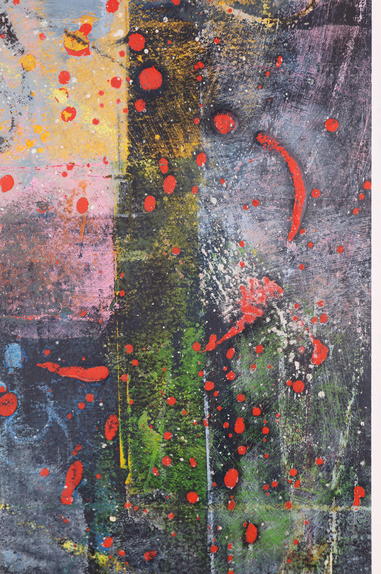 The composition is dense with various colors and gestural marks. It features a mix of vibrant red, yellow, and orange splatters and drips that contrast with the muted tones of blue, gray, and black in the background. Dominating the left side of the canvas is an energetic white scribble that swirls almost into a circular motion. The splashes of color scattered throughout the painting suggest a sense of dynamic movement as if the artist actively engaged with the canvas, adding layers of paint and texture. The backdrop contains areas of what seem to be deliberate brushstrokes as well as more organically spread patches of color, incorporating a mixture of both control and spontaneity. The artwork conveys a sense of raw emotion and could be seen as an exploration of color, form, and the physical act of painting itself.