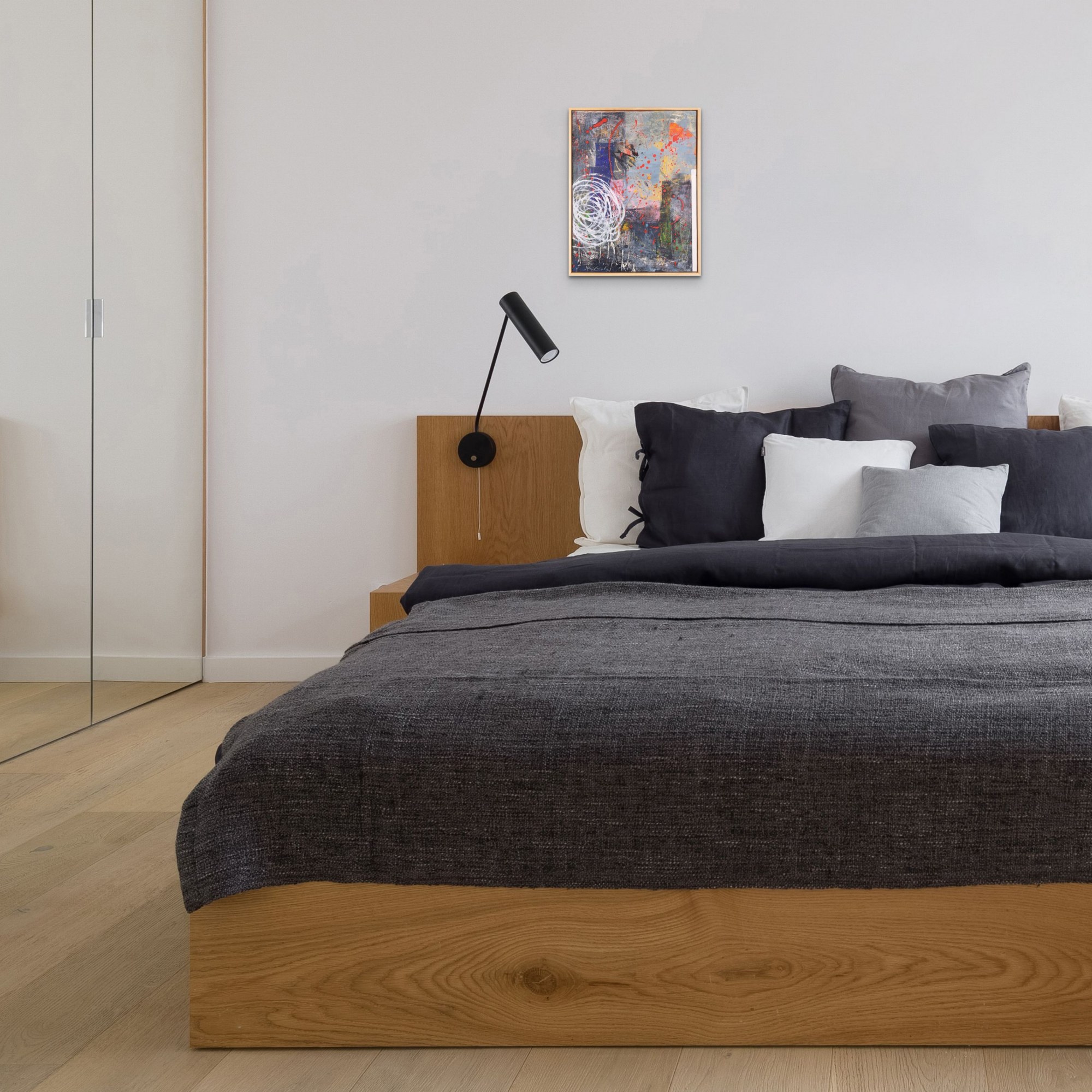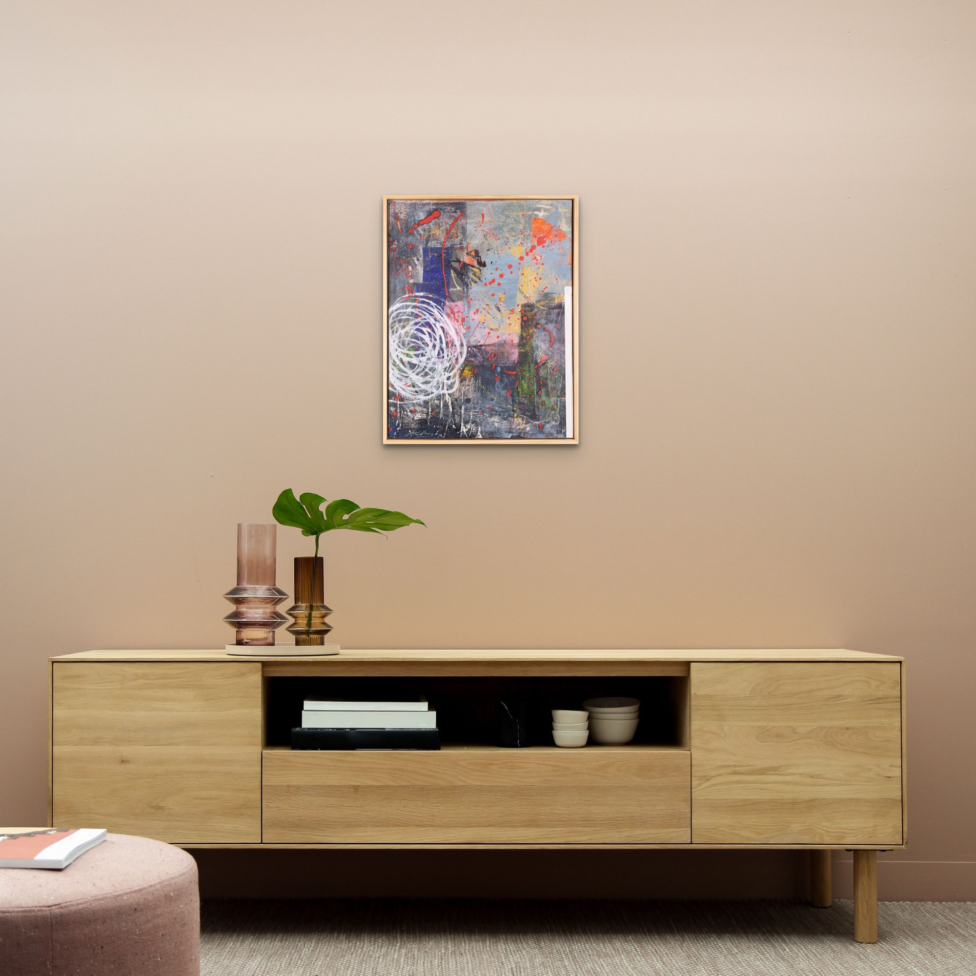 Original mixed media abstract oil painting by Stevenjohn McHugh titled "Counteract". Measures 19.5" x 15.25" x 1.5. Framed size is 20.25 x 16" x 2.5". Mixed media with oil stick, marker, oil, graphite, charcoal and cold wax on Arches oil paper glued on wood panel with PH balance glue. Side of wood cradle (solid wood) is varished natural. Signed on front and back. Framed is a vanished gallery frame solid wood.