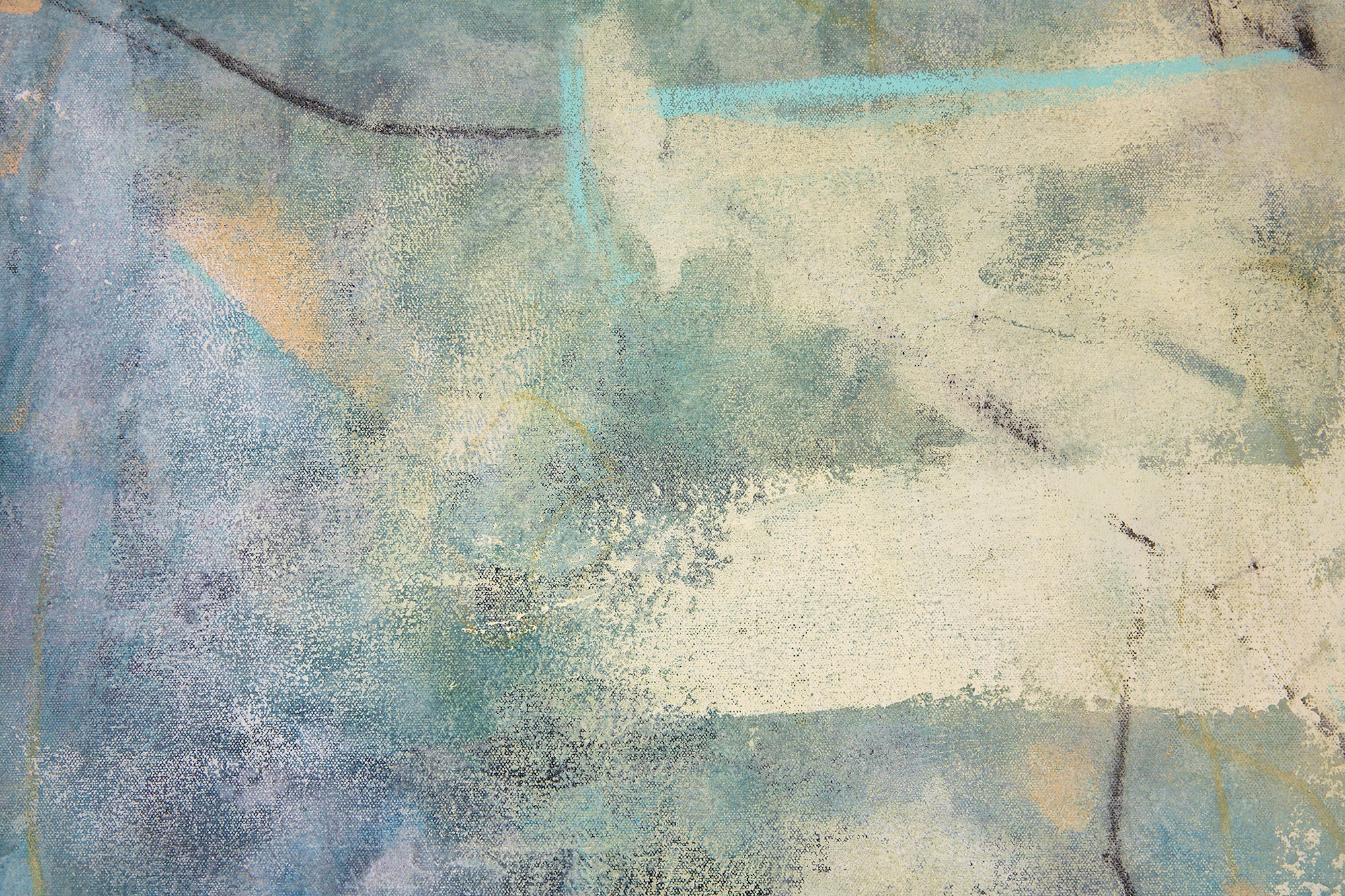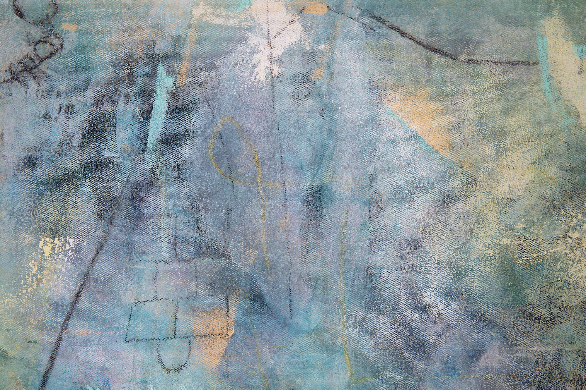 "Day Dreams #2" is an abstract mixed media composition dominated by soft pastel hues of blue, beige, and hints of yellow. The surface is textured with layered washes of color, giving it a misty and ethereal quality. Delicate, thin black lines intersect and create ambiguous geometric shapes, suggesting a subtle structure beneath the diffuse background. The interplay between the blurred color fields and the linear elements conveys a sense of depth and movement throughout the piece. The overall mood is calm and contemplative, inviting viewers to explore the nuanced interactions between color and form.