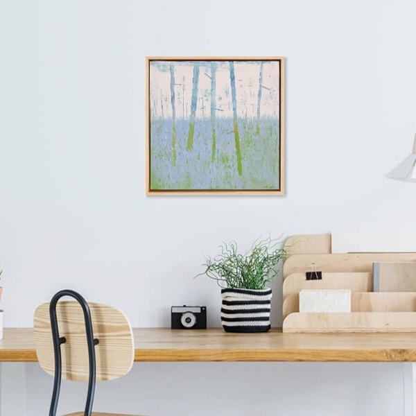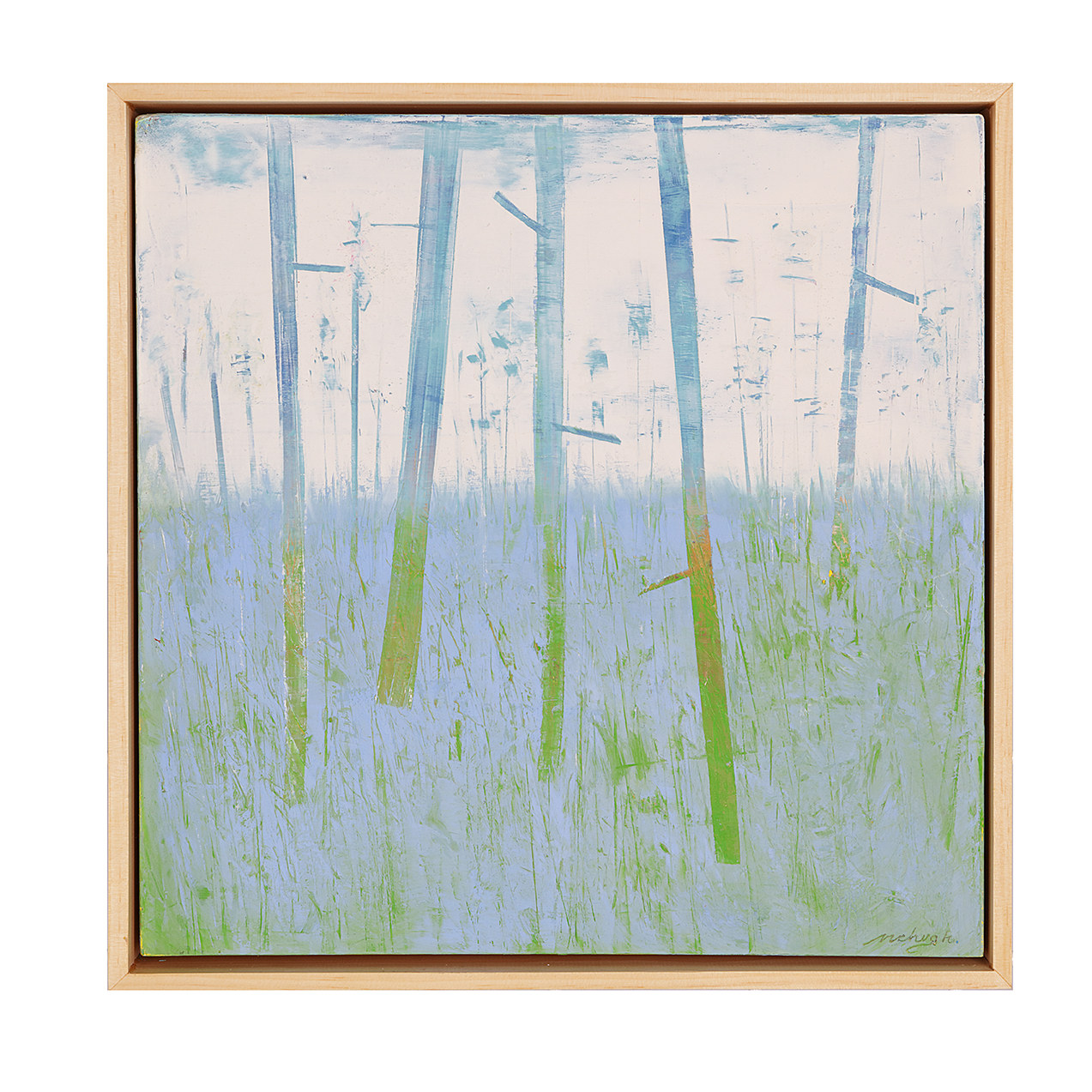 Original mixed media abstract landscape oil painting by Stevenjohn McHugh. Measures 12.75" x 12.75" x 2.5Mixed media with oil stick, marker, oil, graphite, charcoal and cold wax on Arches oil paper glued on wood panel with PH balance glue. Side of wood cradle (solid wood) is varished natural. Signed on front and back. Framed is a vanished gallery frame solid wood.