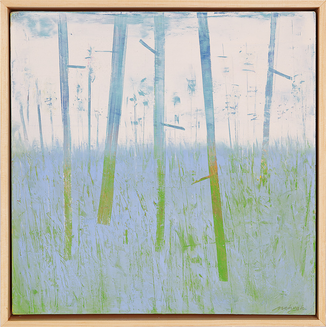 Original mixed media abstract landscape oil painting by Stevenjohn McHugh. Measures 12.75" x 12.75" x 2.5Mixed media with oil stick, marker, oil, graphite, charcoal and cold wax on Arches oil paper glued on wood panel with PH balance glue. Side of wood cradle (solid wood) is varished natural. Signed on front and back. Framed is a vanished gallery frame solid wood.