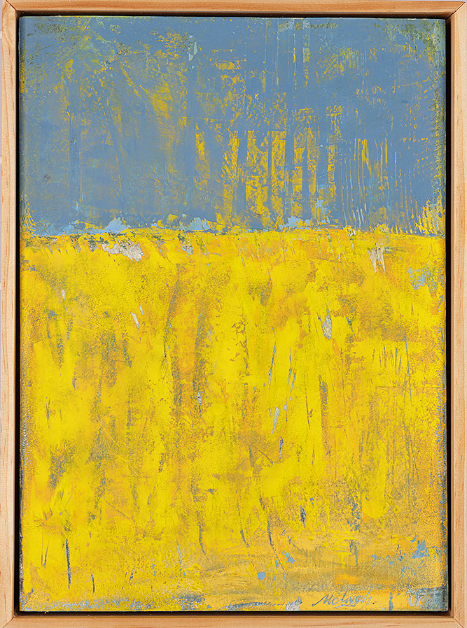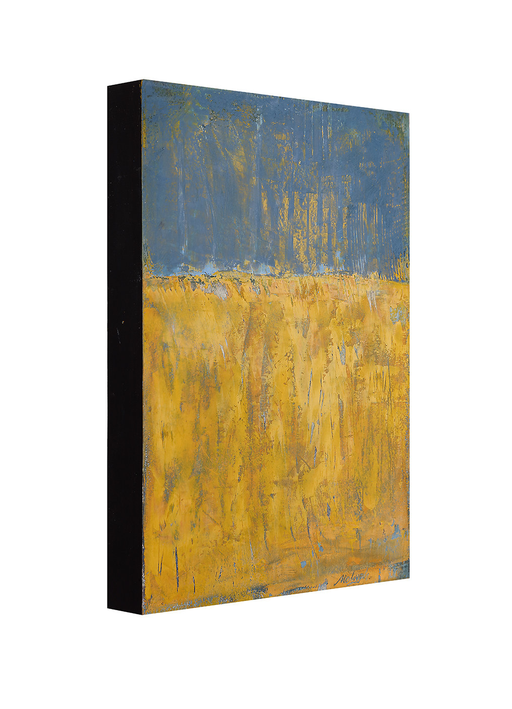Original landscape oil painting by Stevenjohn McHugh. Mixed media oil, graphite, charcoal and cold wax on Arches oil paper glued on wood panel with PH balance glue. Side of wood cradle (solid wood) is painted black and is framed with natural wood finish. Signed on front and back. Finished size measures 14.25" x 10.5" x 2.5".