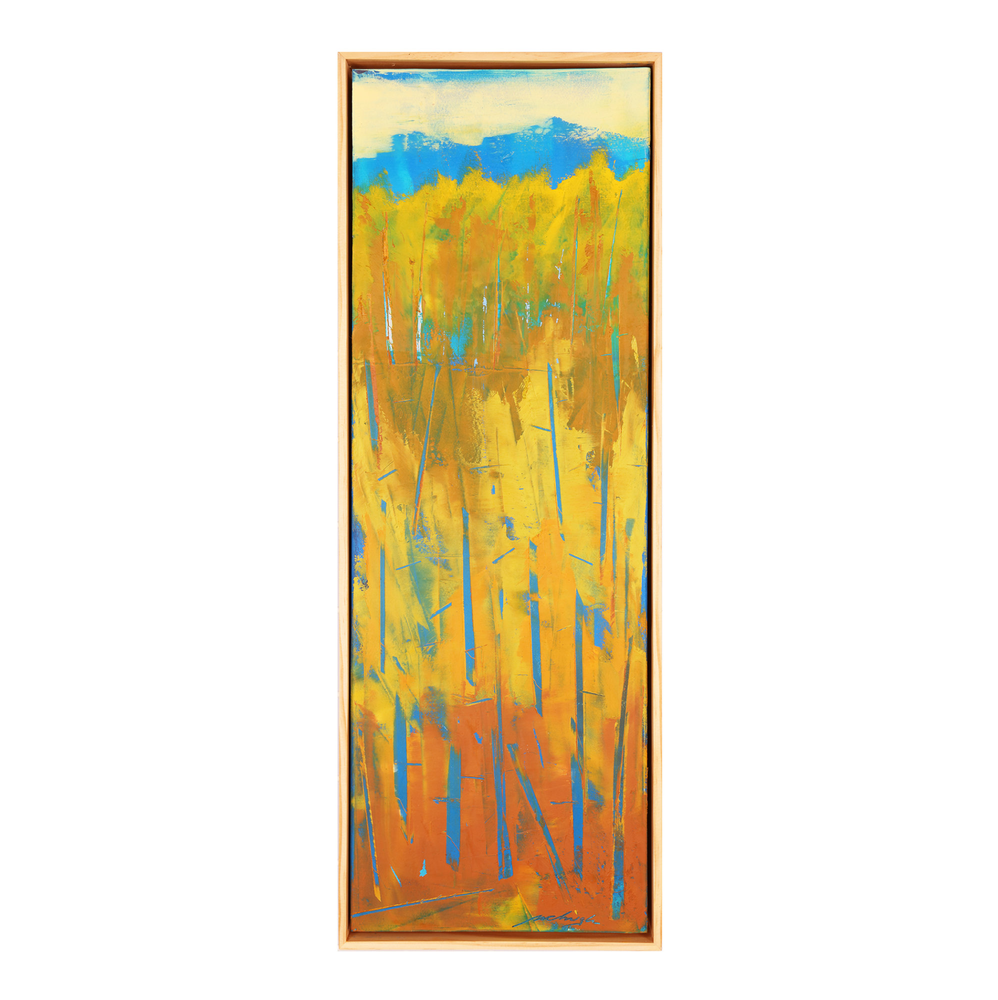 Original mixed media abstract landscape oil painting by Stevenjohn McHugh titled "Color Interaction". Measures 29.5" x 10" x 1.5. Framed size is 30.25 x 10.75" x 2.5". Mixed media with oil stick, marker, oil, graphite, charcoal and cold wax on Arches oil paper glued on wood panel with PH balance glue. Side of wood cradle (solid wood) is varished natural. Signed on front and back. Framed is a vanished gallery frame solid wood.