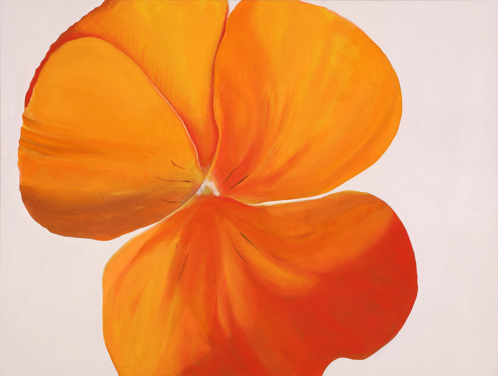 The image shows a vibrant painting of an orange flower occupying the canvas expansively with its full, open petals. The orange hues range from deep red-orange to a bright, almost neon tone, conveying the beauty and depth of the flower's color. The background is minimalistic and plain, allowing the flower itself to be the central focus, and the painting showcases dynamic brushwork and tonal gradations, which emphasize the delicate textures and contours of the petals. Overall, the painting exhibits a mixture of precision and fluidity that brings the subject to life in a striking and bold manner.