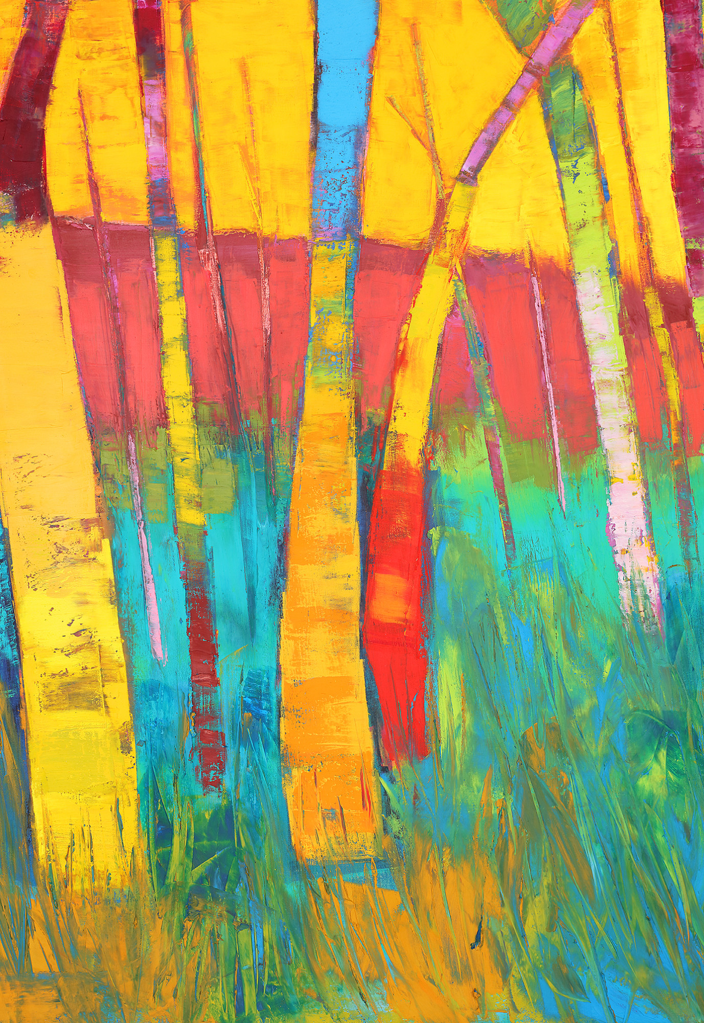 Half of dypotic "Wood Glen" which measures 24" x 96" x 1.5" and is painted with oil on wood panels.