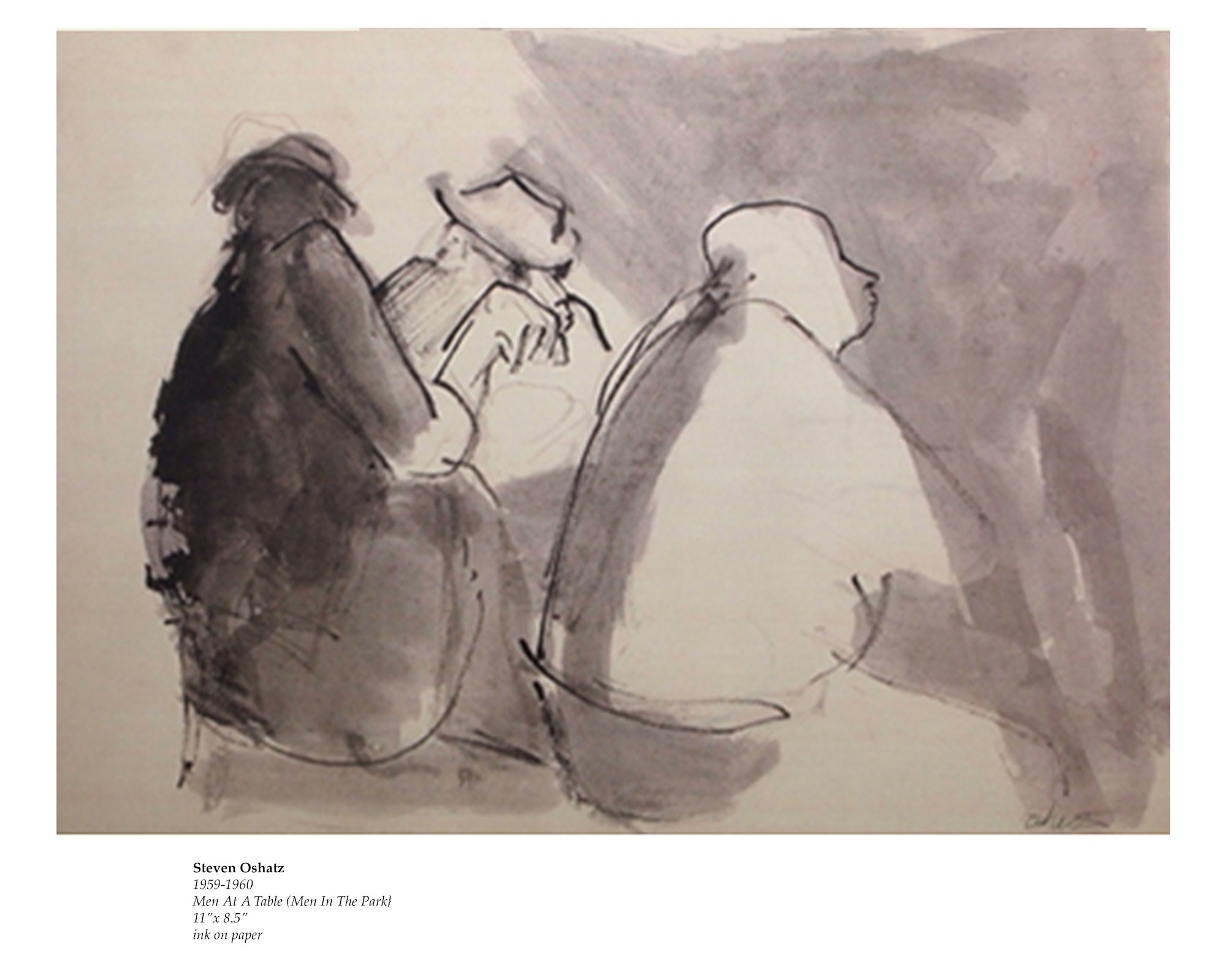 "Men In The Park" is an arrangement of ten (10) framed groupings of ink wash drawings with a framed oil painting on canvas in the center. The oil painting is separately framed with three (3) vertical ink drawings on each side framed individually, and two (2) horizontal ink drawings at top framed individually and two (2) drawings at the bottom framed individually.