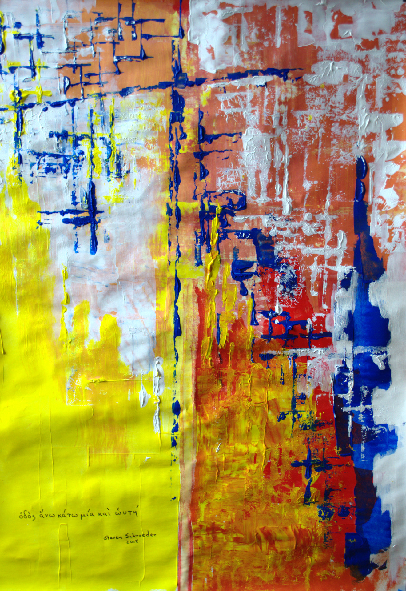 This meditation on a fragment of Heraclitus ("the way up and the way down are one and the same") is part of a series called "a gift of fire." I didn't set out to paint a crucifix, but the cruciform structure of the piece is undeniable, and I did have death and resurrection in mind (particularly Derrida's “gift" of death) as I created it. The fragment also calls to mind the concept of apocatastasis associated with Origen, and the interplay of those concepts – death, resurrection, and apocatastasis – informs the painting. Water media on bamboo paper created an interesting interplay of fluidity and control that mirrors the interplay of openness and totality woven into “Western" thought. In this painting and in the series, I had my eye on the explosive fragments by which we know thinkers like Heraclitus who have allowed some light to break through when we mind the gaps in the shadow of totality.