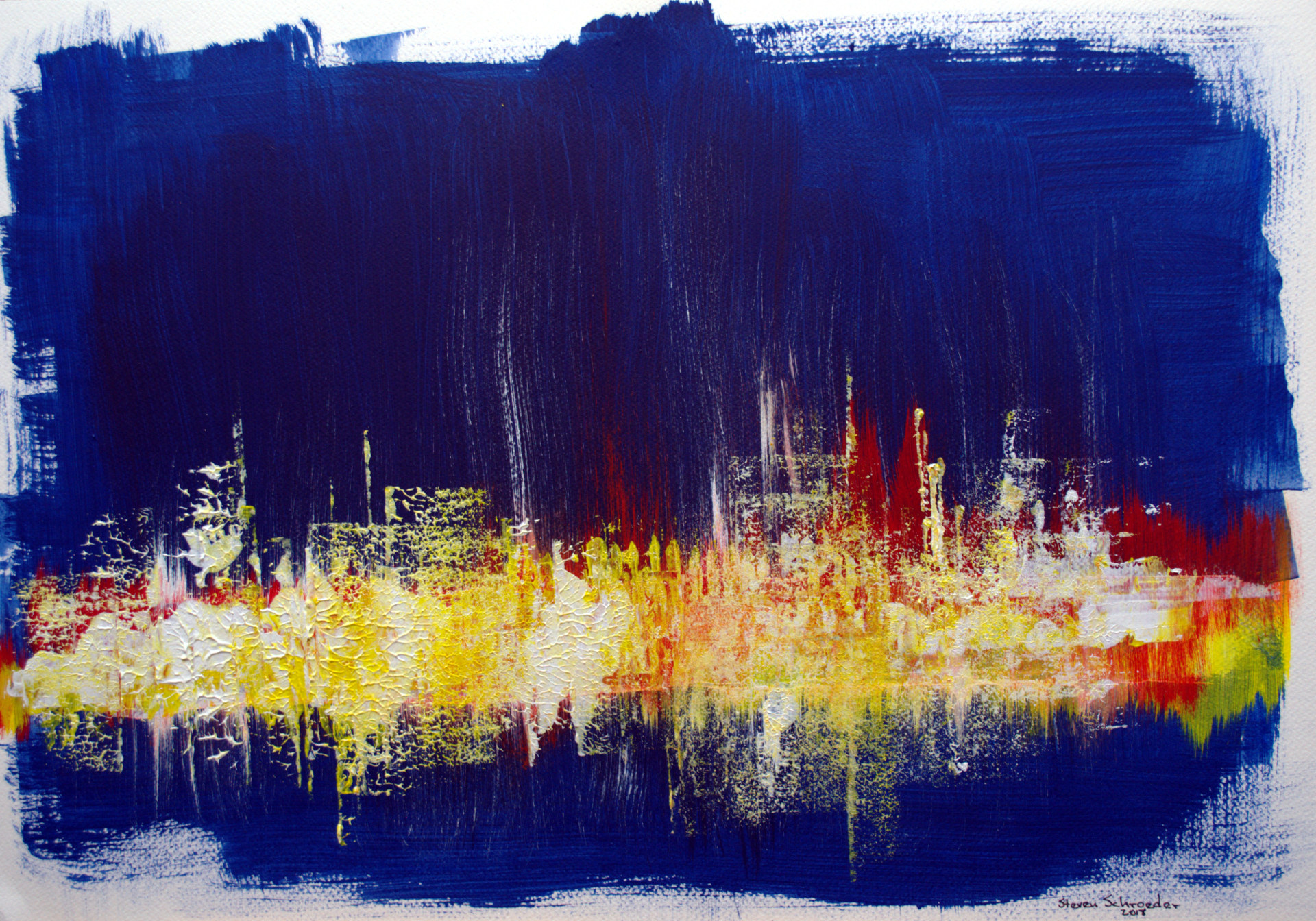 Abstract acrylic on 14x20 inch 140 lb cold pressed paper. Mounted in an 18x24 inch mat with 2.25 inch borders on all sides, with archival backing and styrene glazing.
