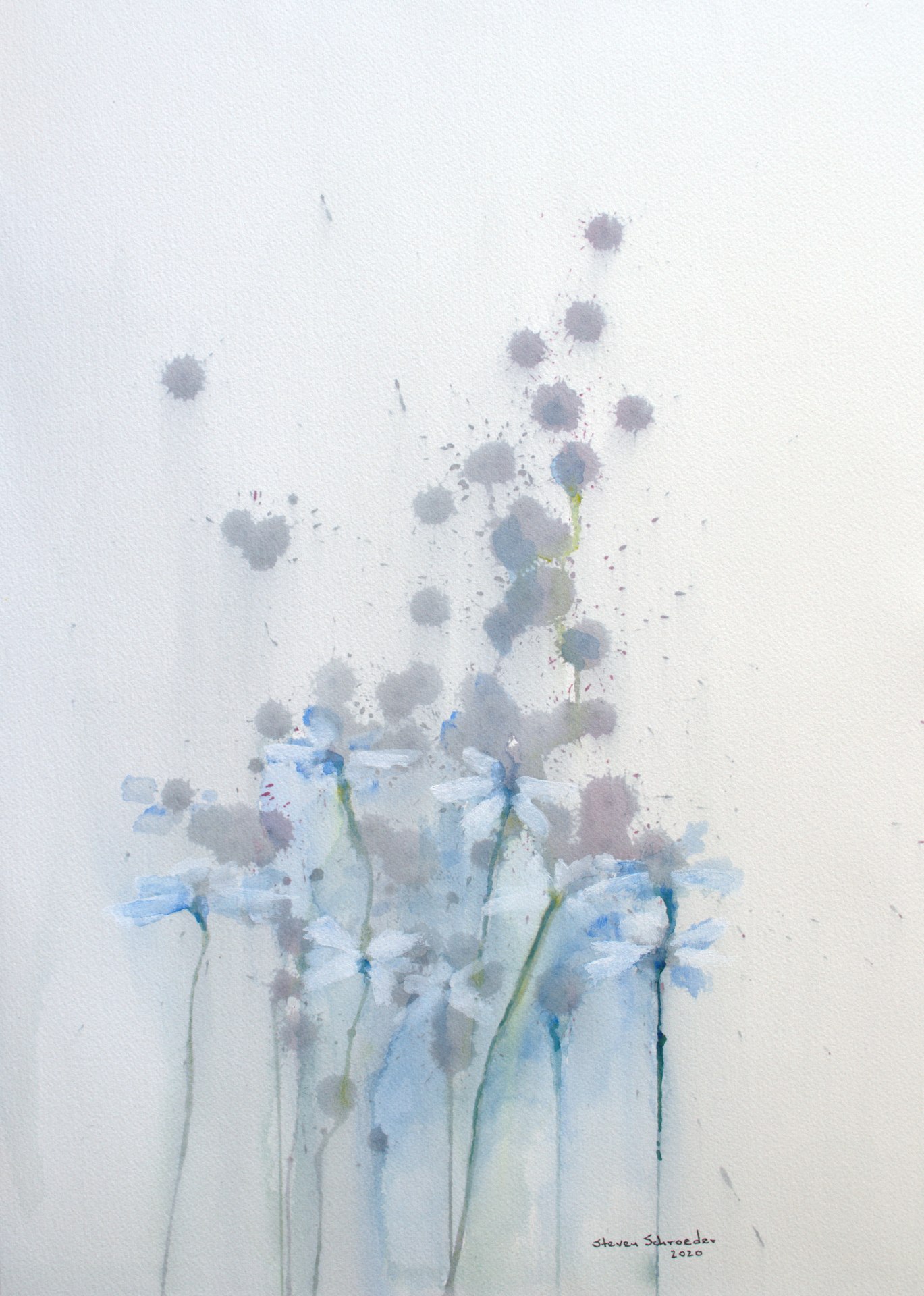 The title is a translation of a phrase that appears in slightly different forms in two of the synoptic gospels, Matthew 6:28 (καταμάθετε τὰ κρίνα τοῦ ἀγροῦ πῶς αὐξάνουσιν) and Luke 12:27 (κατανοήσατε τὰ κρίνα πῶς αὐξάνει). It seems to me that both suggest careful study of how wildflowers grow (not just a glance at the pretty flowers), and that's the direction I have gone in this series of paintings, most of which are smaller (postcard size). In this piece (which is 14 x 20 inches), as in all the paintings in the series, I've allowed the paint to flow with minimal intervention, allowing the flowers to move (as wildflowers do) the way liquid moves on paper. For this painting, I've used natural pigments (a mixture of berry juices) for the flowers, along with cobalt blue, cadmium yellow, and titanium white.