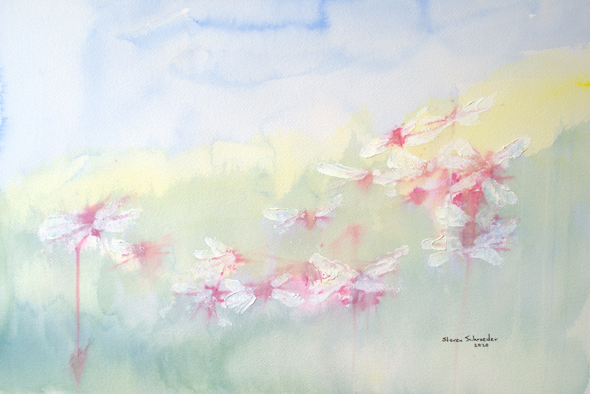 The title is a translation of a phrase that appears in slightly different forms in two of the synoptic gospels, Matthew 6:28 (καταμάθετε τὰ κρίνα τοῦ ἀγροῦ πῶς αὐξάνουσιν) and Luke 12:27 (κατανοήσατε τὰ κρίνα πῶς αὐξάνει). It seems to me that both suggest careful study of how wildflowers grow (not just a glance at the pretty flowers), and that's the direction I have gone in this series of paintings, most of which are smaller (postcard size). In this piece (which is 20 x 14 inches), as in all the paintings in the series, I've allowed the paint to flow with minimal intervention, allowing the flowers to move (as wildflowers do) the way liquid moves on paper. For this painting, I've used natural pigment (from beets) for the flowers, along with cobalt blue, cadmium yellow, and titanium white.