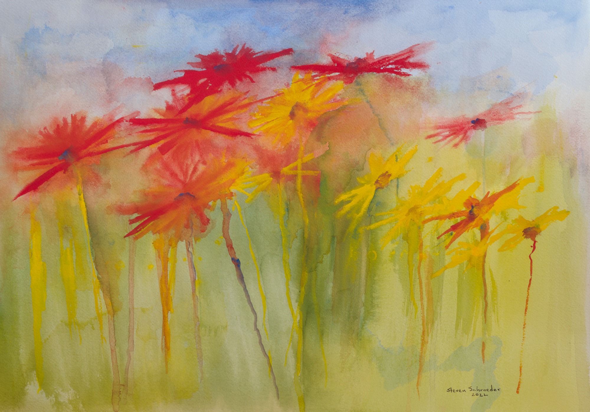 The title is a translation of a phrase that appears in slightly different forms in two of the synoptic gospels, Matthew 6:28 (καταμάθετε τὰ κρίνα τοῦ ἀγροῦ πῶς αὐξάνουσιν) and Luke 12:27 (κατανοήσατε τὰ κρίνα πῶς αὐξάνει). It seems to me that both suggest careful study of how wildflowers grow (not just a glance at the pretty flowers), and that's the direction I have gone in this series of paintings, most of which are smaller (postcard size). In this piece (which is 14 x 20 inches), as in all the paintings in the series, I've allowed the paint to flow with minimal intervention, allowing the flowers to move (as wildflowers do) the way liquid moves on paper.
