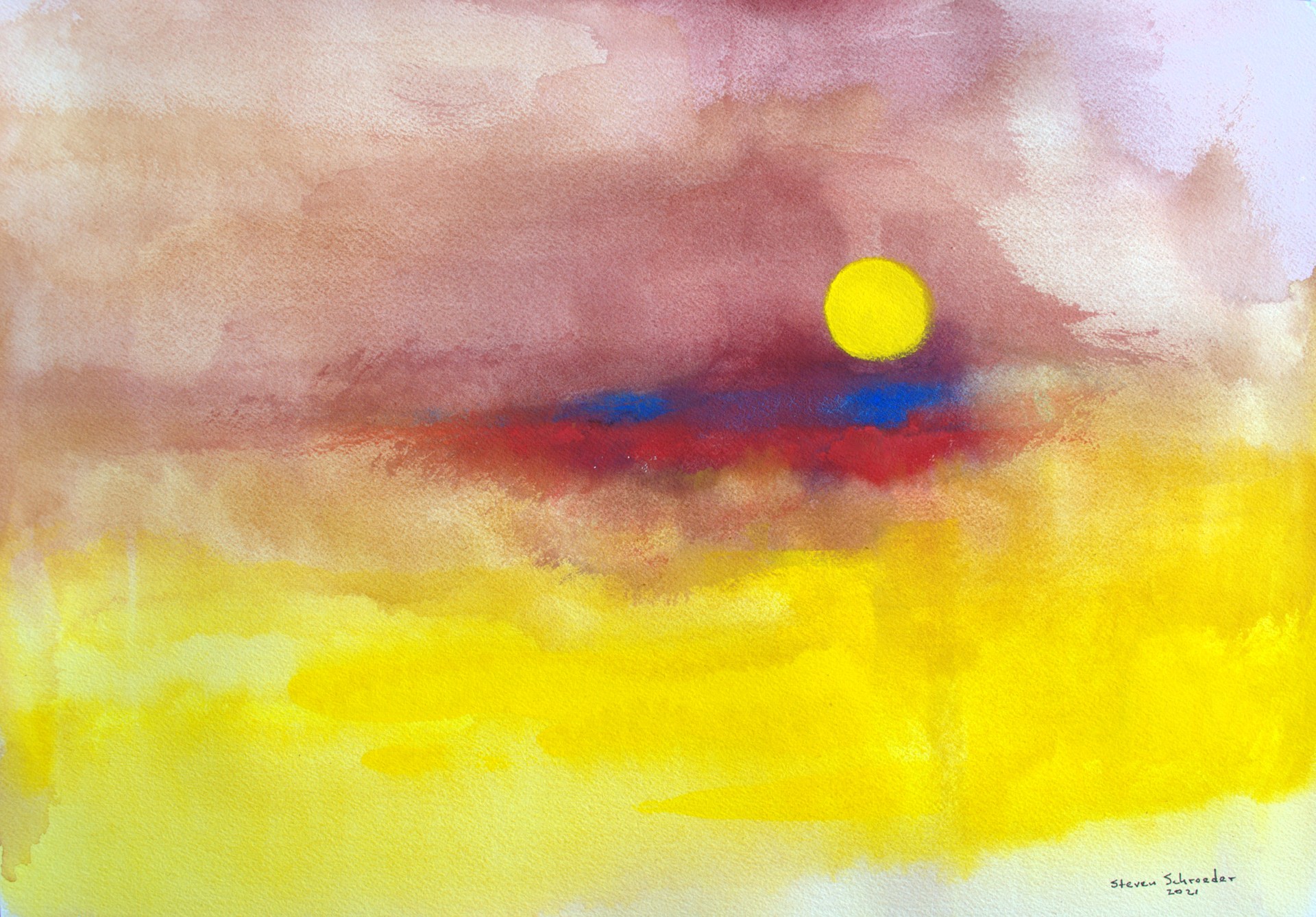 For this piece, I thoroughly dampened the top sheet of an Arches block of 140 lb cold pressed paper and applied pigment with a wet brush. Yellow is the main event, but there is also red and a touch of blue. I invite you to step inside and see where it takes you.