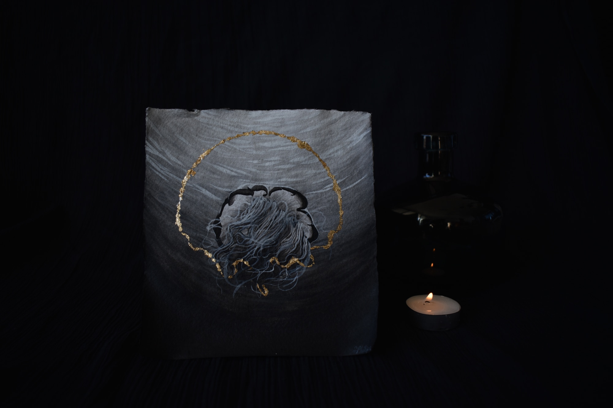 This is a 15cm square watercolour, gouache and gold leaf piece, on Khadi cotton rag paper. It shows a jellyfish against light filtering down from above, in monochromatic black and white, broken only by a beautiful gold leaf circlet entangled in the tentacles of the jellyfish.