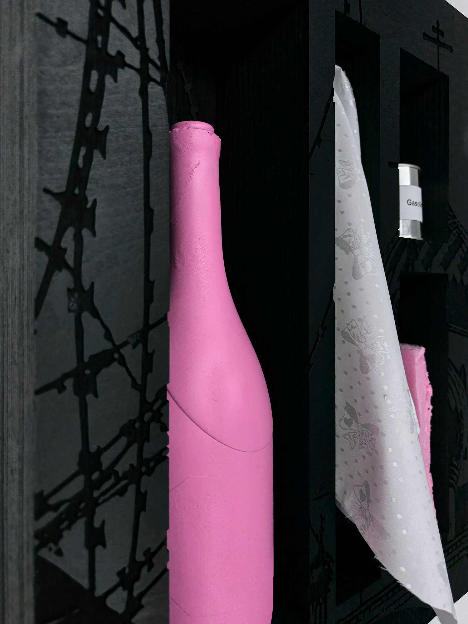 Molotov kit - do it yourself! This artwork features an engraving of barbed wire and a Russian prison church, evoking nostalgia for the artist, who spent two years of her youth in a penal colony following a protest. The piece carries a distinctly feminine touch, challenging the popular notion that femininity cannot embody danger and rebellion.