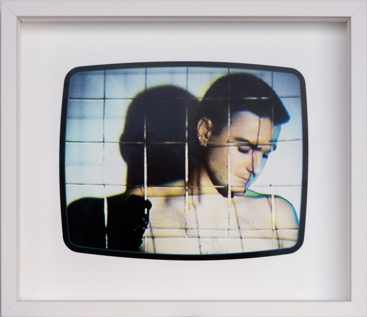 From an original photograph in a studio setup, 1984. The subject, on set, was being filmed by a single channel video recorder with a direct link to a CRT monitor. The camera directly photographed the image that appeared in real-time on the monitor as the subject performed in front of the video recorder. No actual video recording was ever made.