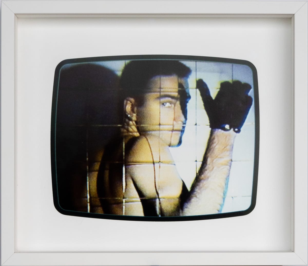 From an original photograph in a studio setup, 1984. The subject, on set, was being filmed by a single channel video recorder with a direct link to a CRT monitor. The camera directly photographed the image that appeared in real-time on the monitor as the subject performed in front of the video recorder. No actual video recording was ever made.