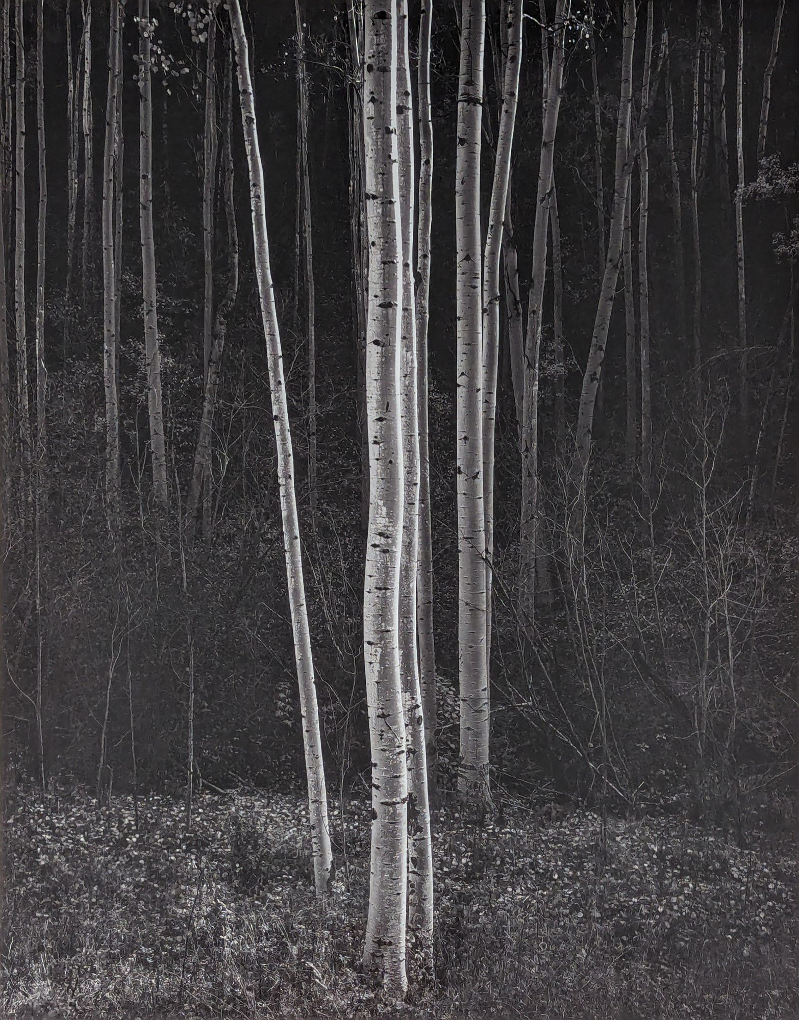 The trunks of several trees are in the center. The background is filled with the trunks of many other trees and bushes, all cast in shadow