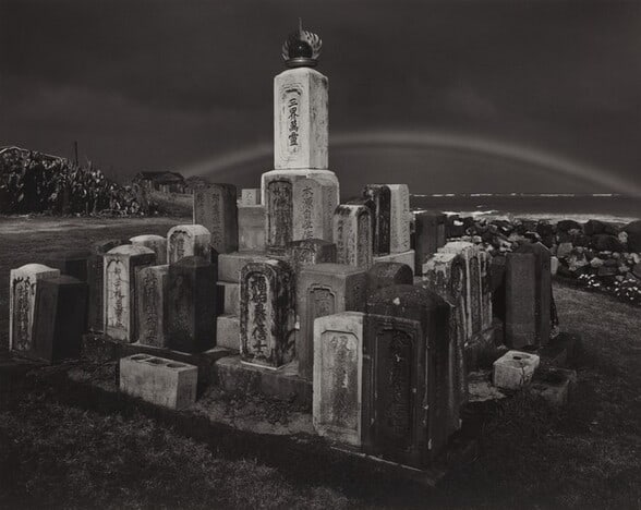 This photograph shows a Buddhist shrine of many graves in a pyramid formation. The background shows a rocky coast, and a rainbow spans the sky.