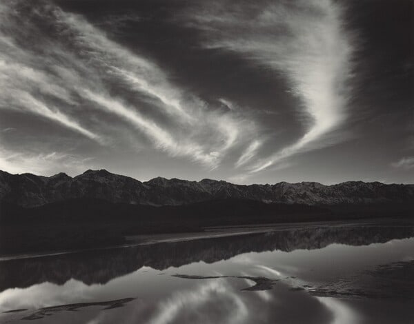 A reflective lake is surrounded by mountains. Long white clouds span the top of the photograph