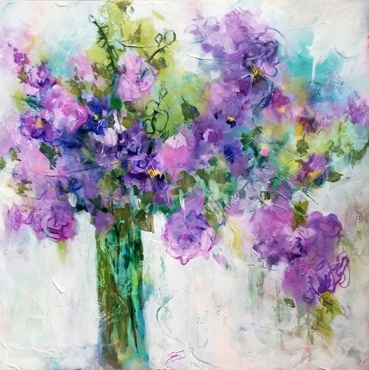 Whimsical floral study on deep, studio wrapped textured canvas.