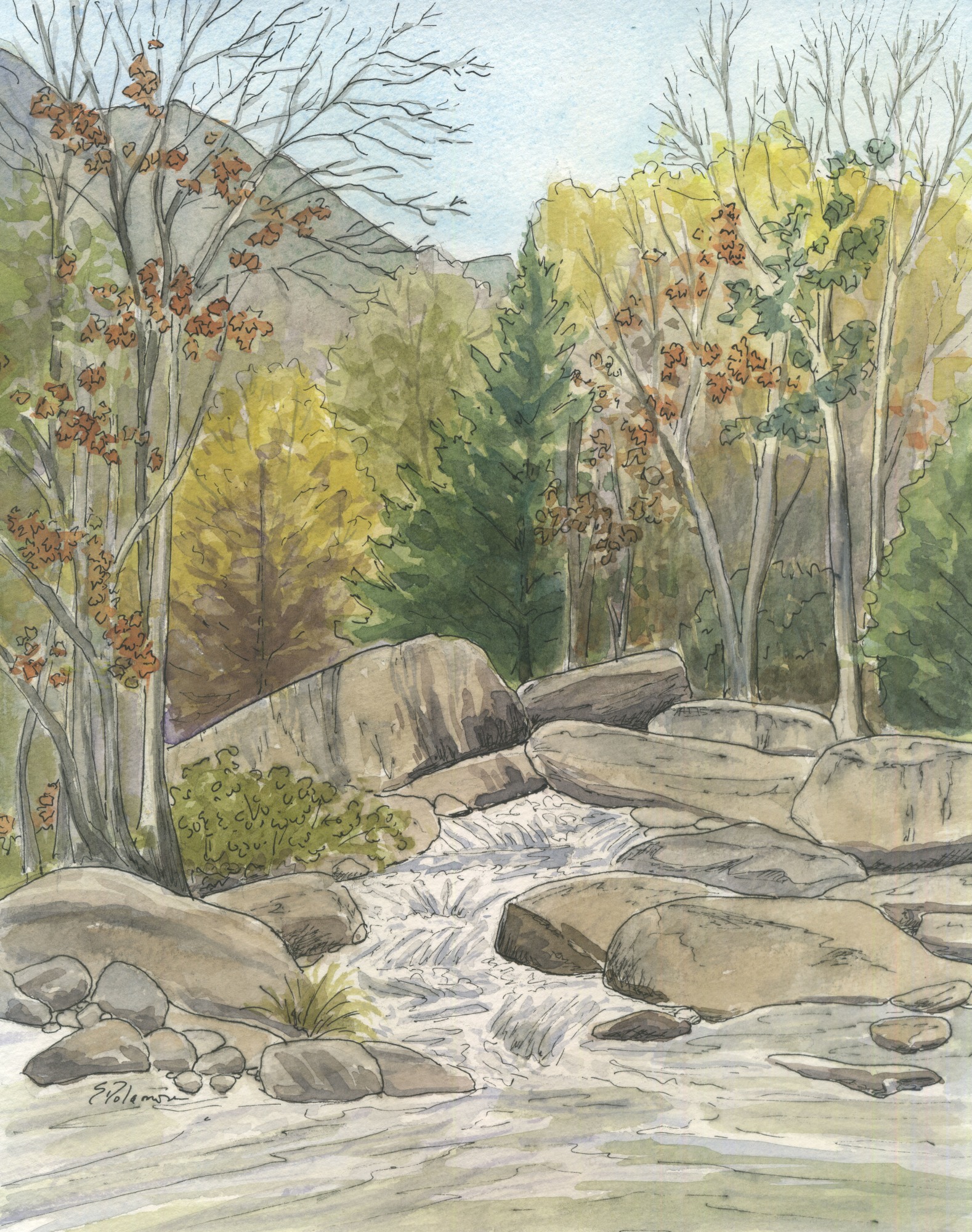 This rendering of a section of the Hickory Nut gorge near Chimney Rock is painted in watercolor and finished with fine linework. It is presented in a white mat in an 11" x 14" semi-rustic walnut stained wood frame and UV protective, reflection reduced conservation glass.