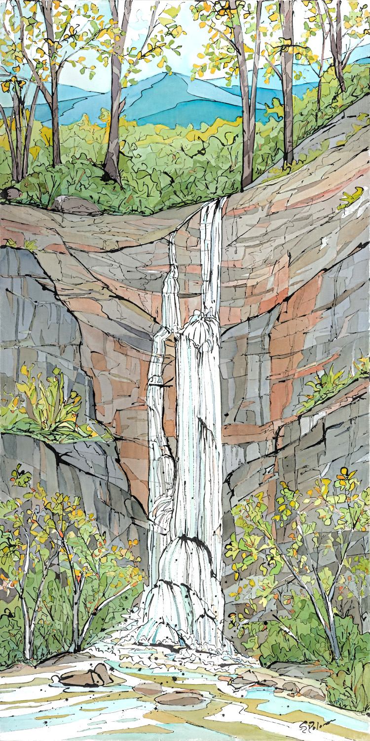 This 24" x 48", watercolor and india ink on canvas depicts a waterfall in the mountains. It is finished with cold wax, giving it a moisture safe velvety finish.
