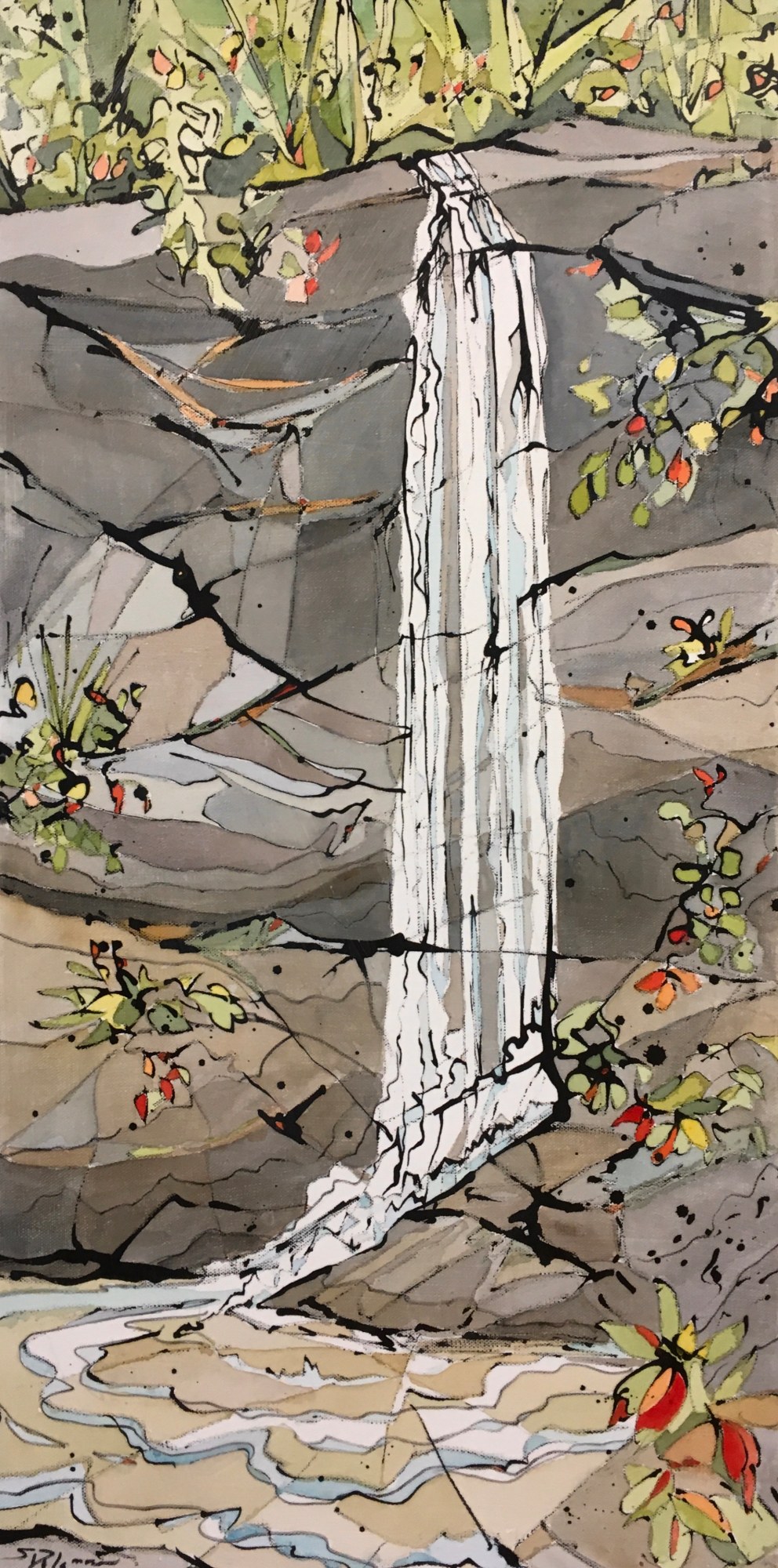 Inspired by the cascades and waterfalls throughout the Big Ivy Forest in Western North Carolina, this piece is an abstract interpretation painted on deep gallery wrapped canvas using india ink and watercolor. 15 x 30.