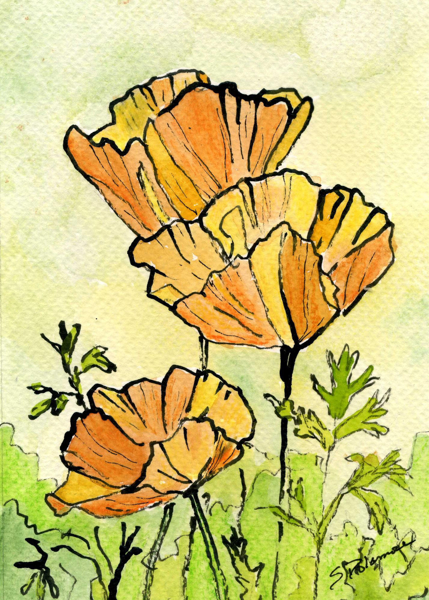 "Orange Echoes" is a watercolor and india ink painting of orange poppies. It is a 5" x 7" painting presented in a 8" x 10" white mat and framed in a dark wood frame with the highest quality, 99% UV protective glass with reduced reflection.