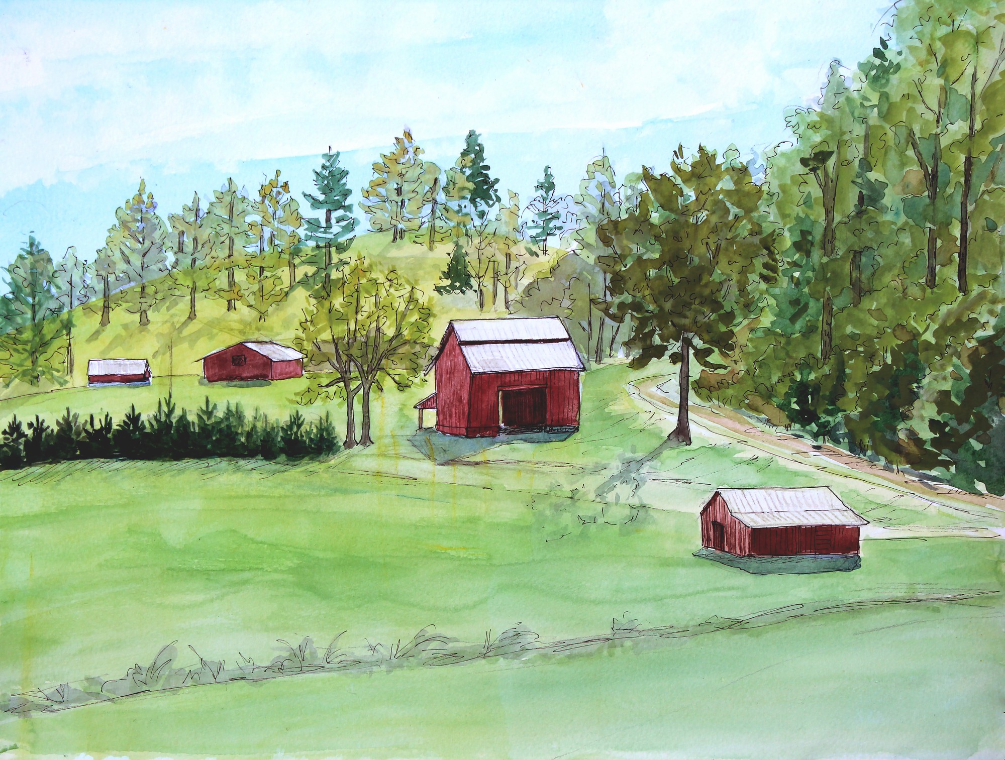 Inspired by the beautiful valleys in the mountains of WNC, where small family farms continue. Painted in watercolor, this 12 x 16 painting is presented in a 16 x 20 white mat with protective plastic sleeve.