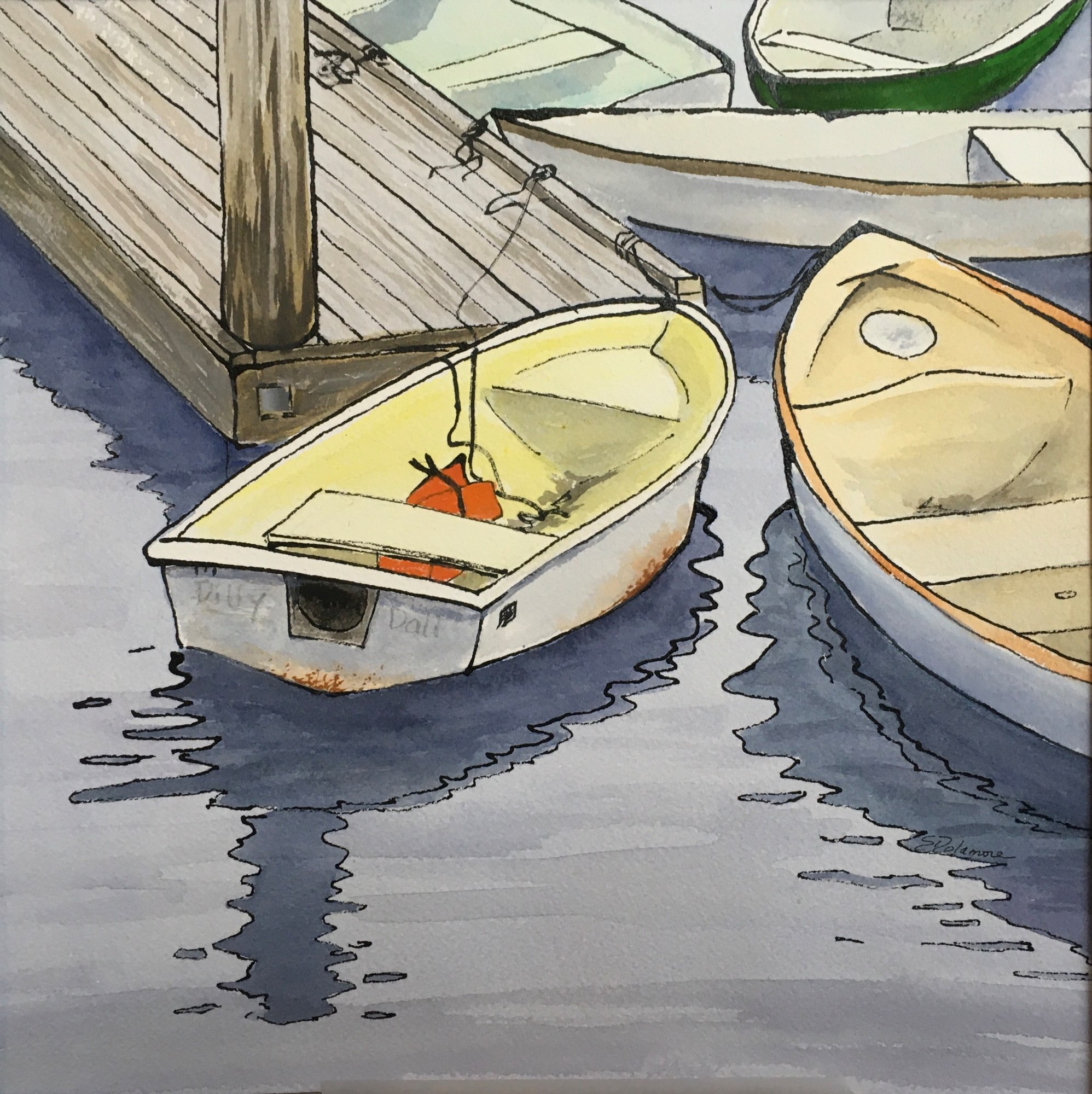 Boats at the dock, Dilly Dali, blue gray with pale yellow and orange, watercolor and india ink, 12 x 12 painting in a white, 16 x 16 inch mat.
