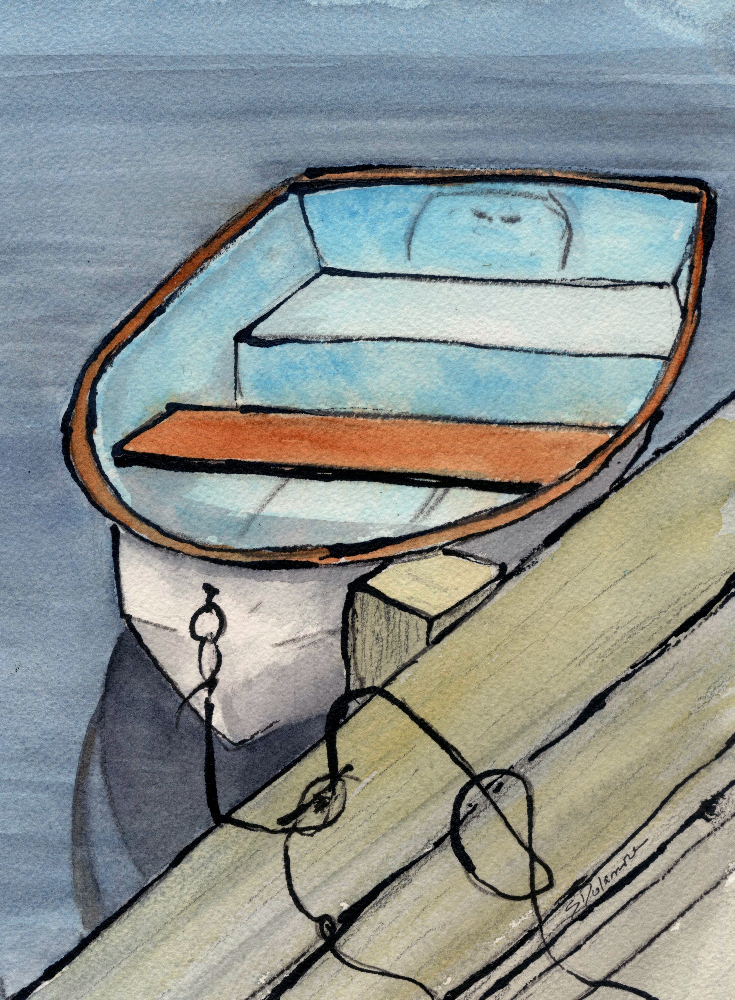 Single white row boat with blue interior at the dock, watercolor and india ink, 9 x 7 painting with a 11 x 14 white mat and dark wood frame.