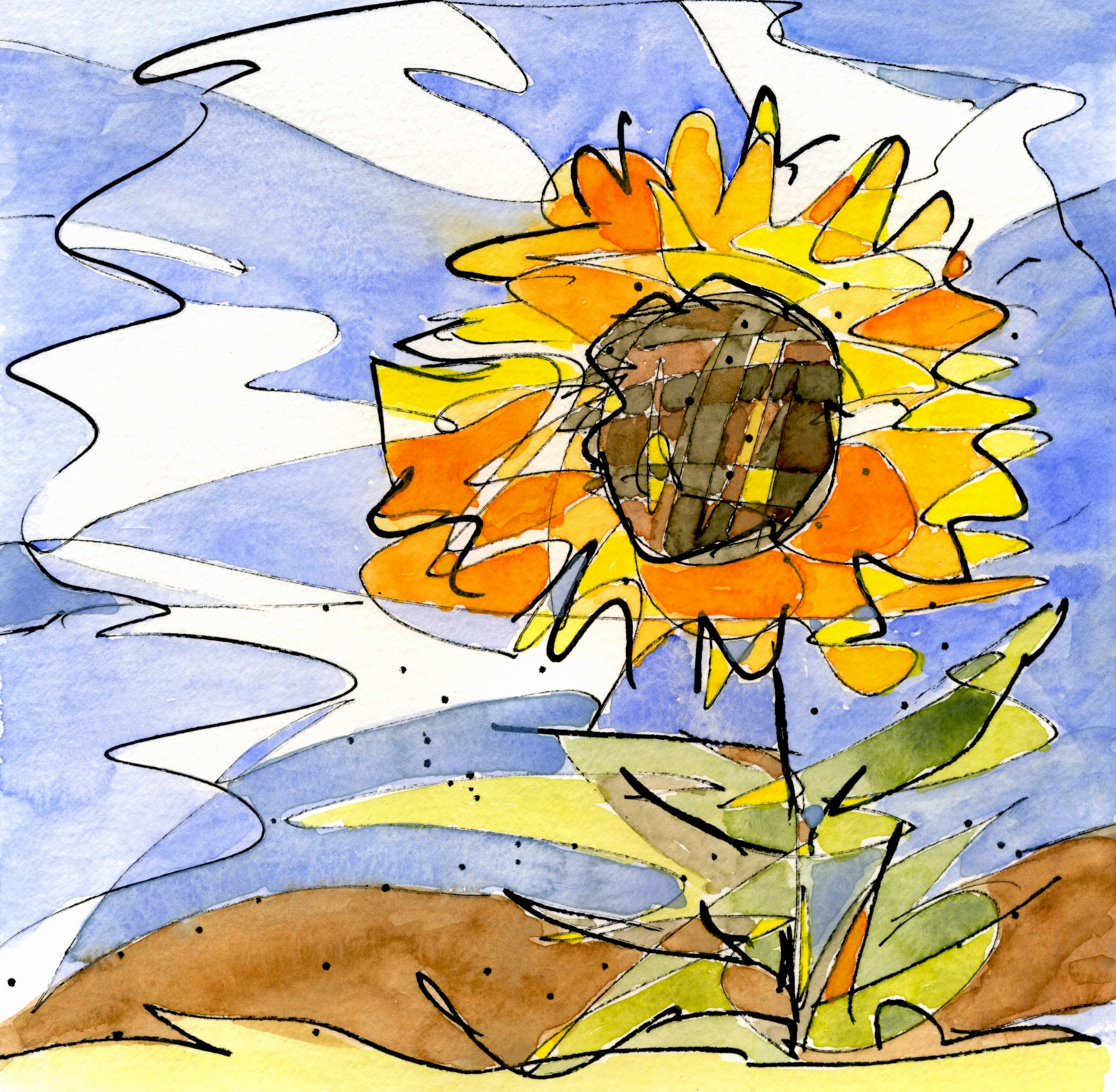 This 8 x 8 abstract watercolor and acrylic pen painting depicts a sunflower in the field. It is presented in a 12 x 12 white mat with protective plastic sleeve.