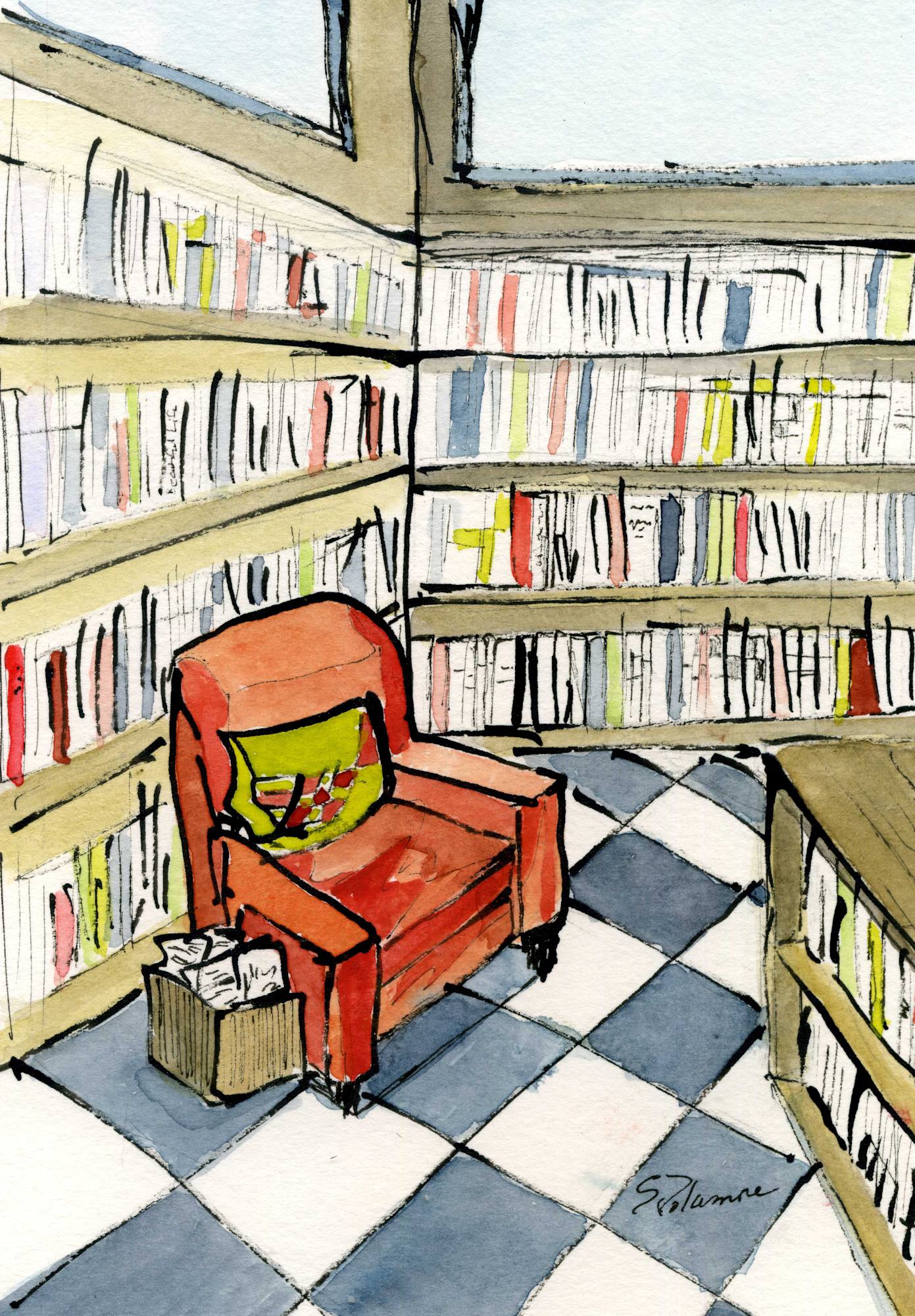 "The Reading Nook" depicts a comfy red-orange chair in the corner of a library. Rendered in india ink and watercolor on 6" x 8 inch paper, it is presented in a 9" x 12" white mat with a protective plastic sleeve.