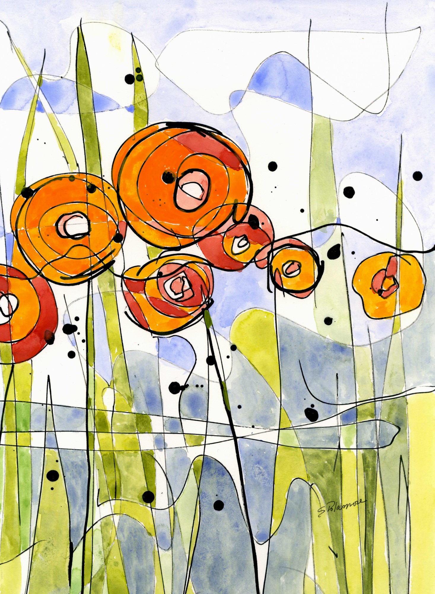 8 x 10 watercolor and acrylic pen painting , limited palette of orange, green and blue, abstract floral field flowers presented in a white 11 x 14 mat with protective plastic sleeve.