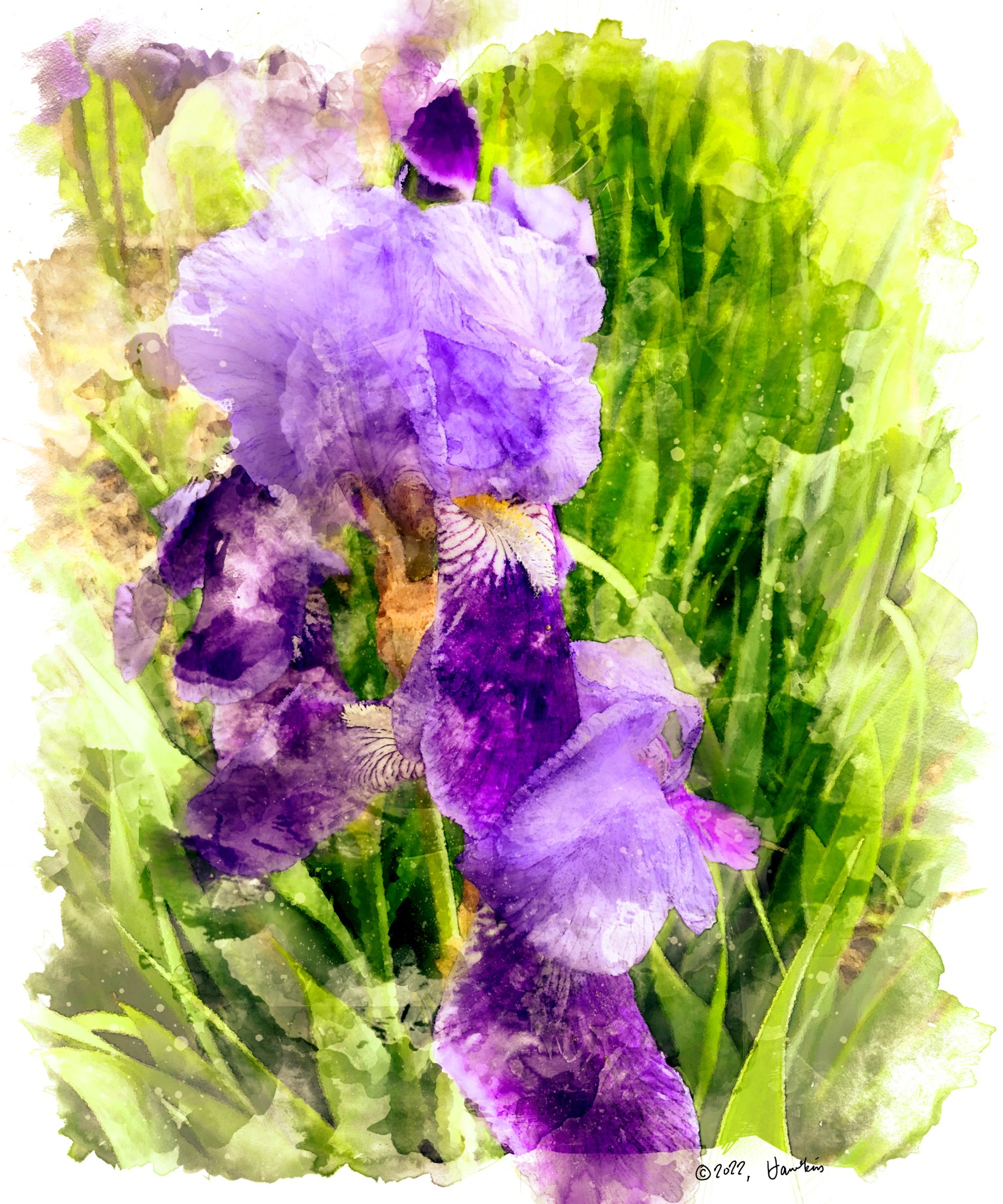 A view of a bearded iris bloom, growing in a garden; reference photo by Karen LeClair