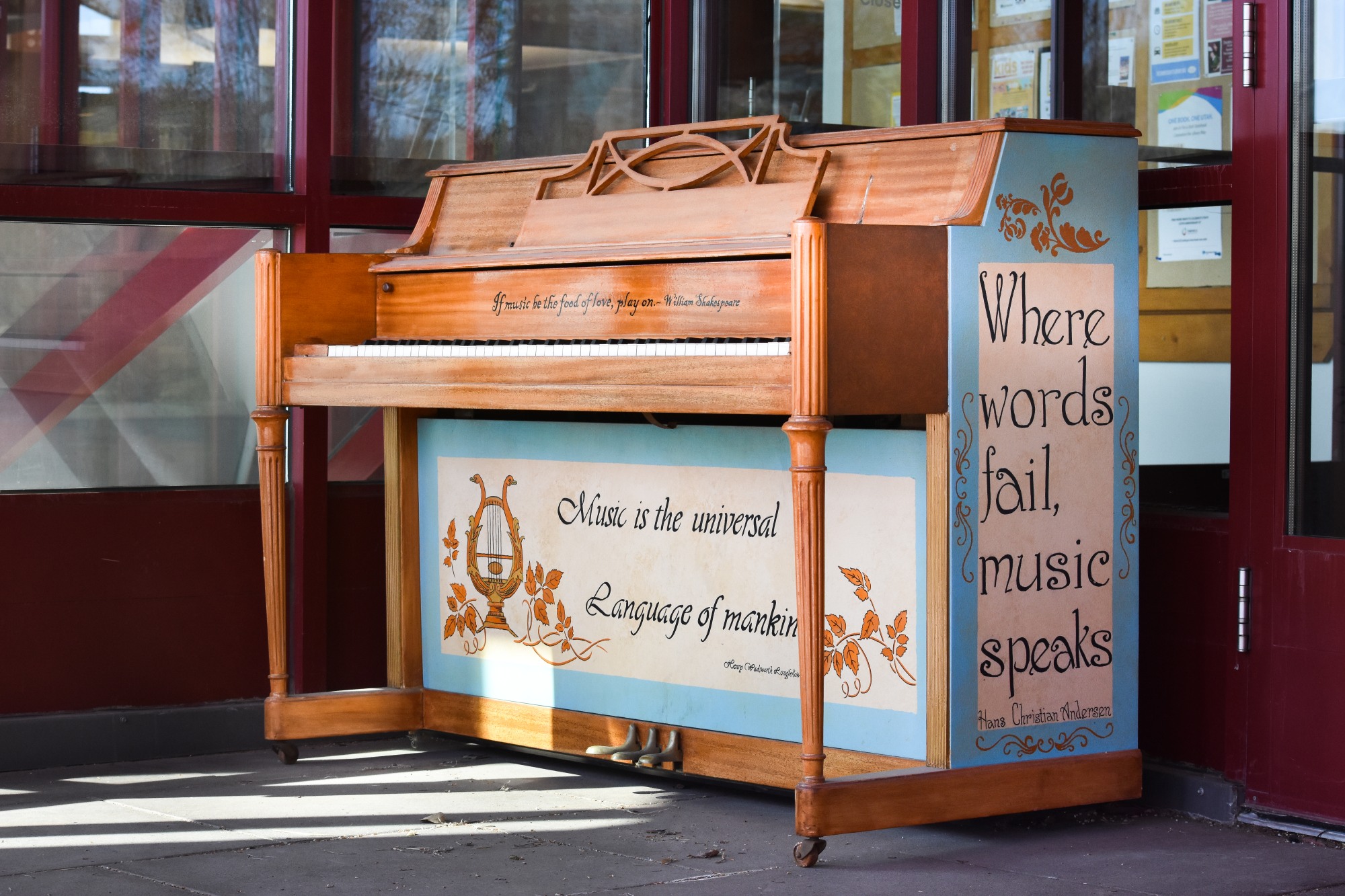 Renee Mox Hall's painted piano, placed for public use on the patio of the Summit County Library in Kimball Junction, features quotes about music from classic literature. Quotes from Henry Wadsworth Longfellow, Hans Christian Andersen, Thomas Carlyle, Miguel de Cervantes and William Shakespeare adore the piano's painted panels and are offset by meticulously restored natural wood of the piano's other surfaces. The piano is the second Mox Hall has painted in the Art Pianos for All program, which has placed more than a dozen pianos for public use areas around the county.