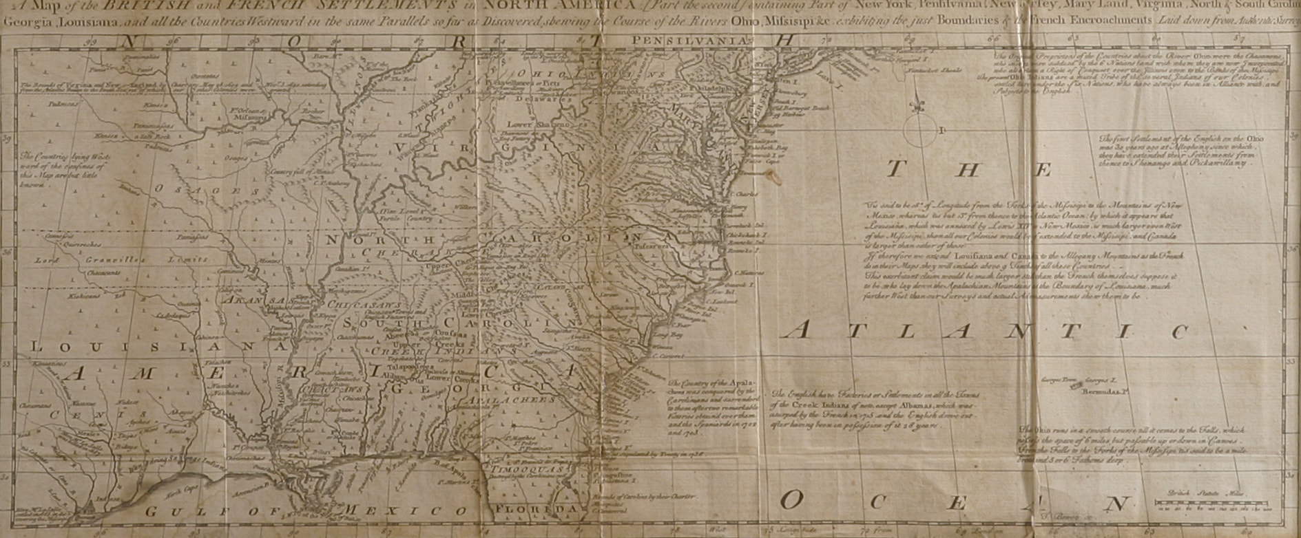 The British French Lower map displays part of the lower eastern portion of North America and a large section of the Atlantic Ocean. The top reads “A Map of the British and French Settlements in North America [part the second] containing Part of New York, Pennsylvania, New Jersey, Mary Land, Virginia, North & South Carolina, Georgia, Louisianna, and all the Countries Westward in the same parallels so far as Discovered showing the Course of the Rivers Ohio, Mississippi, &e exhibiting the just Boundaries of the French Encroachments Laid down from Authentic Survey.”