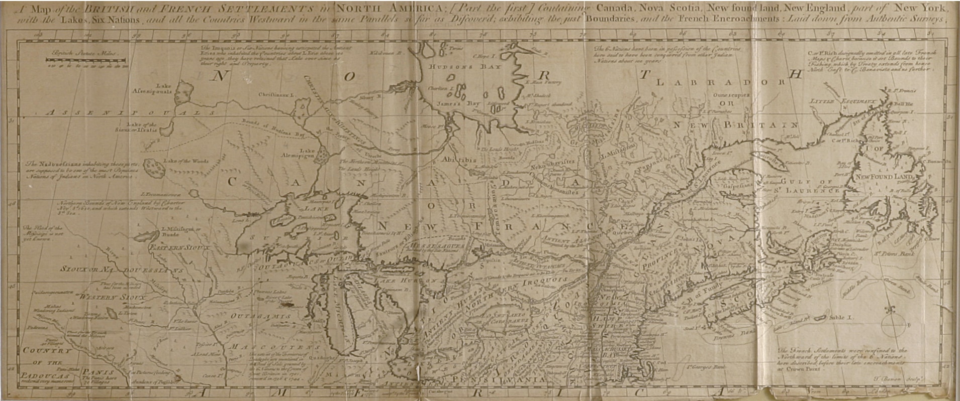 The British French Upper map displays part of the upper portion of North America. The top reads “A Map of the British and French Settlements in North America [part the first] containing Canada, Nova Scotia, New found land, New England, part of New York, with the Lakes, Six Nations, and all the Countries Westward in the same parallels so far as Discovered the just Boundaries of the French Encroachments: Laid down from Authentic Survey.”