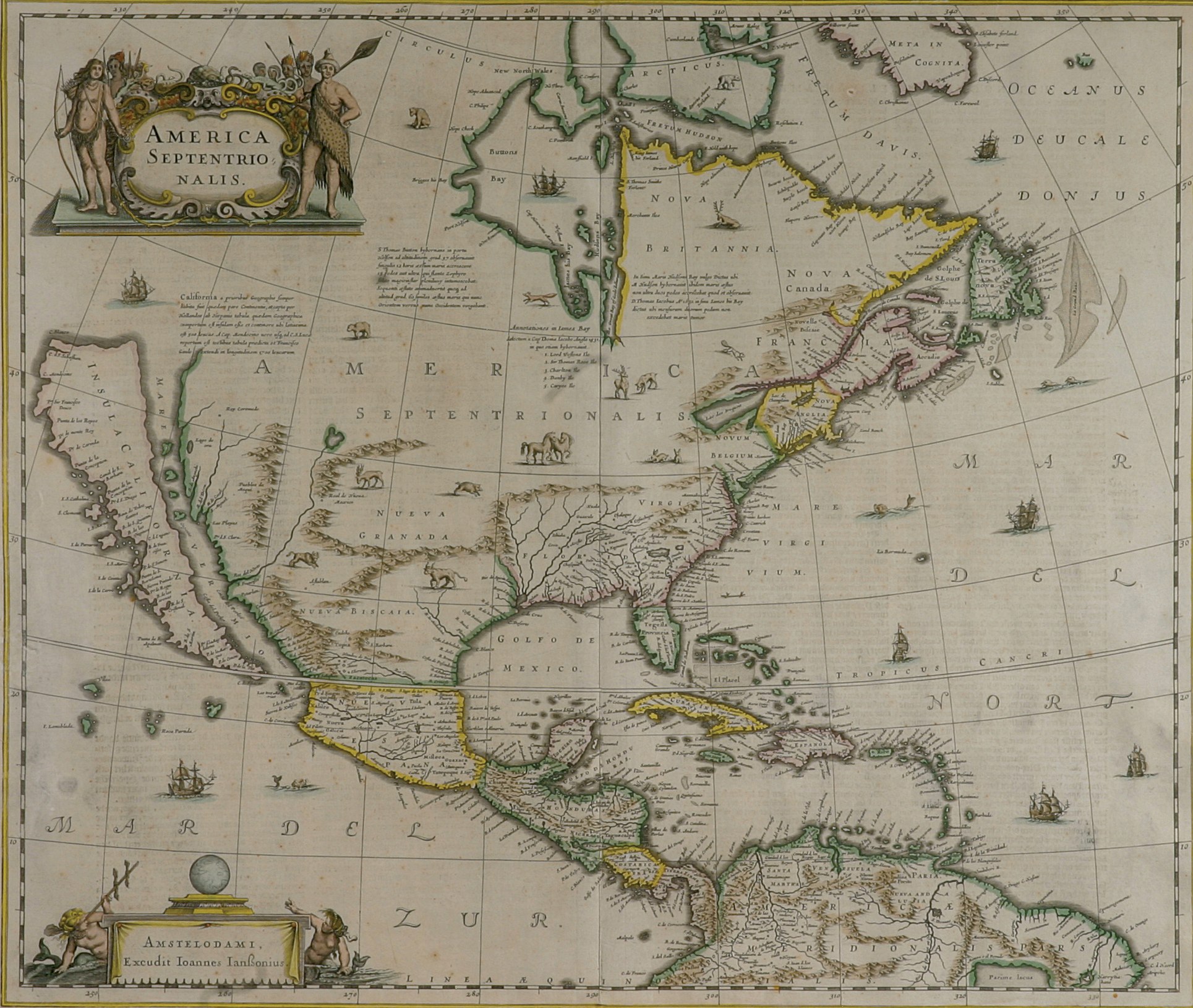 America Septentrionalis is the first separate Dutch atlas map of North America. The map displays what is now North America, Central America, and part of South America. California is depicted as an island and there are small drawings of various animals across the continents. Only one of the Great Lakes is shown – Lac des Iroquis and the map has light coloring. The title is in the top left corner, surrounded on either side by people holding various weapons. In the bottom left corner is a table with the words “Amstelodami, Excudit Ioannes Ianßonius” written on a hanging sheet. There is a globe on top of the table and a mermaid is on either side.