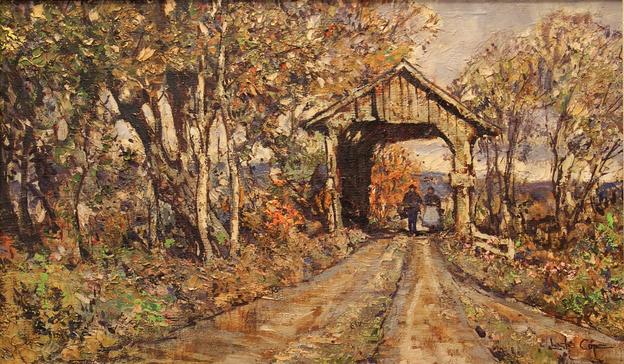 A vertical oil painting depicting a path going through a covered bridge with two people inside. There are man trees lining either side, all painted with a warm, muted autumnal palette.