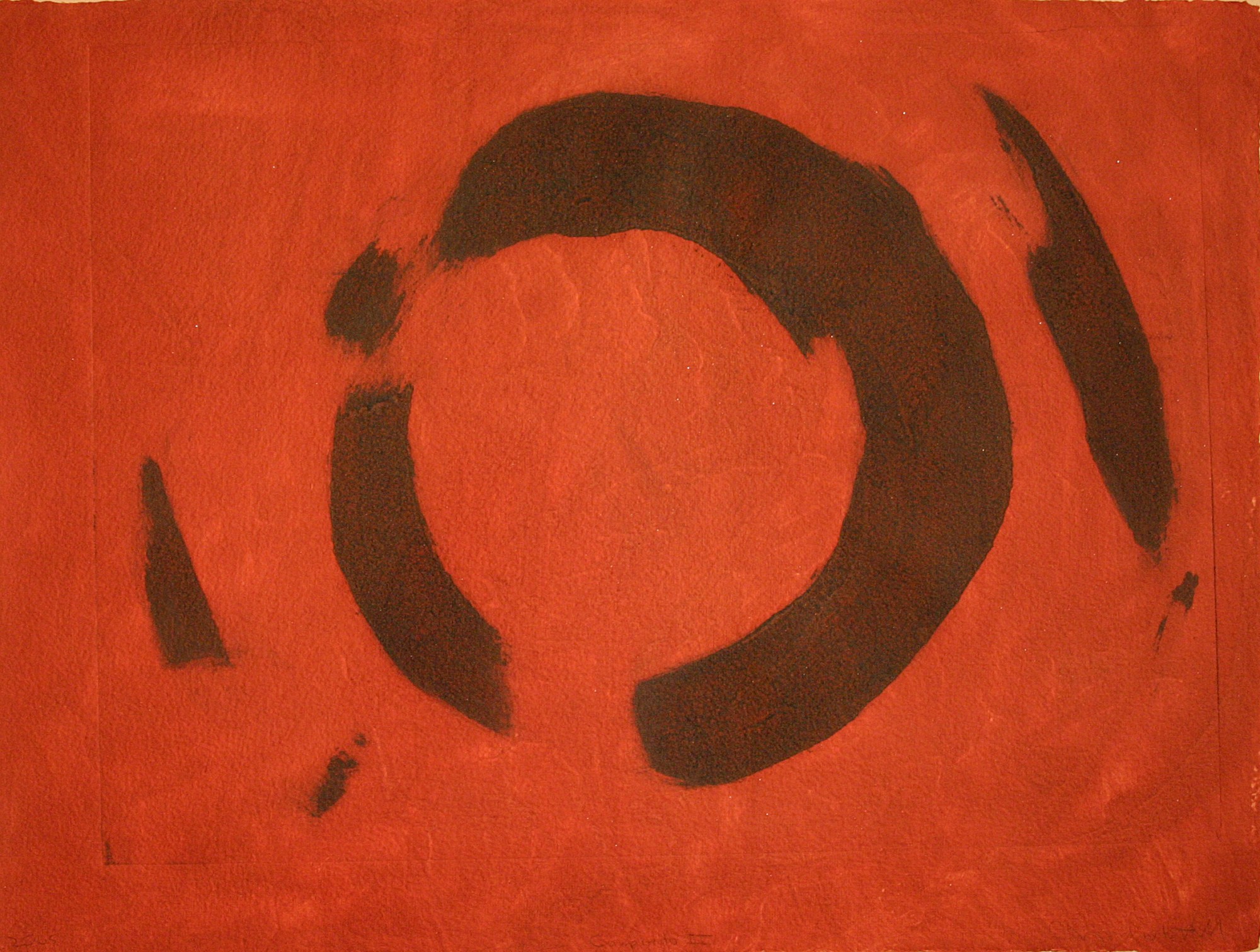 A vertical carborundum aquatint. It depicts a circular stroke of grey on a red background.
